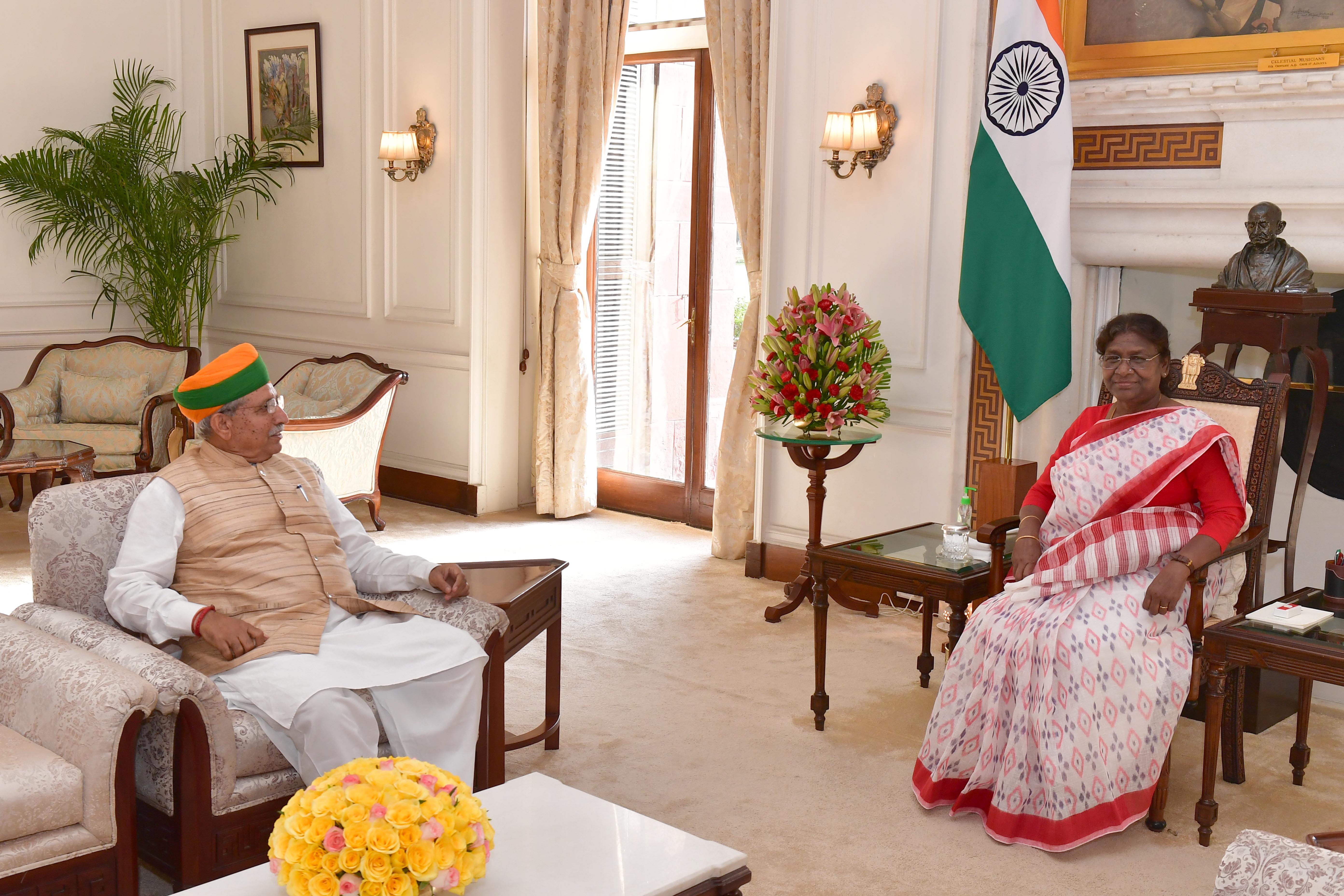 The Minister of State for Parliamentary Affairs and Culture, Shri Arjun Ram Meghwal calling on the President of India, Smt. Droupadi Murmu, at Rashtrapati Bhavan on August 01, 2022.