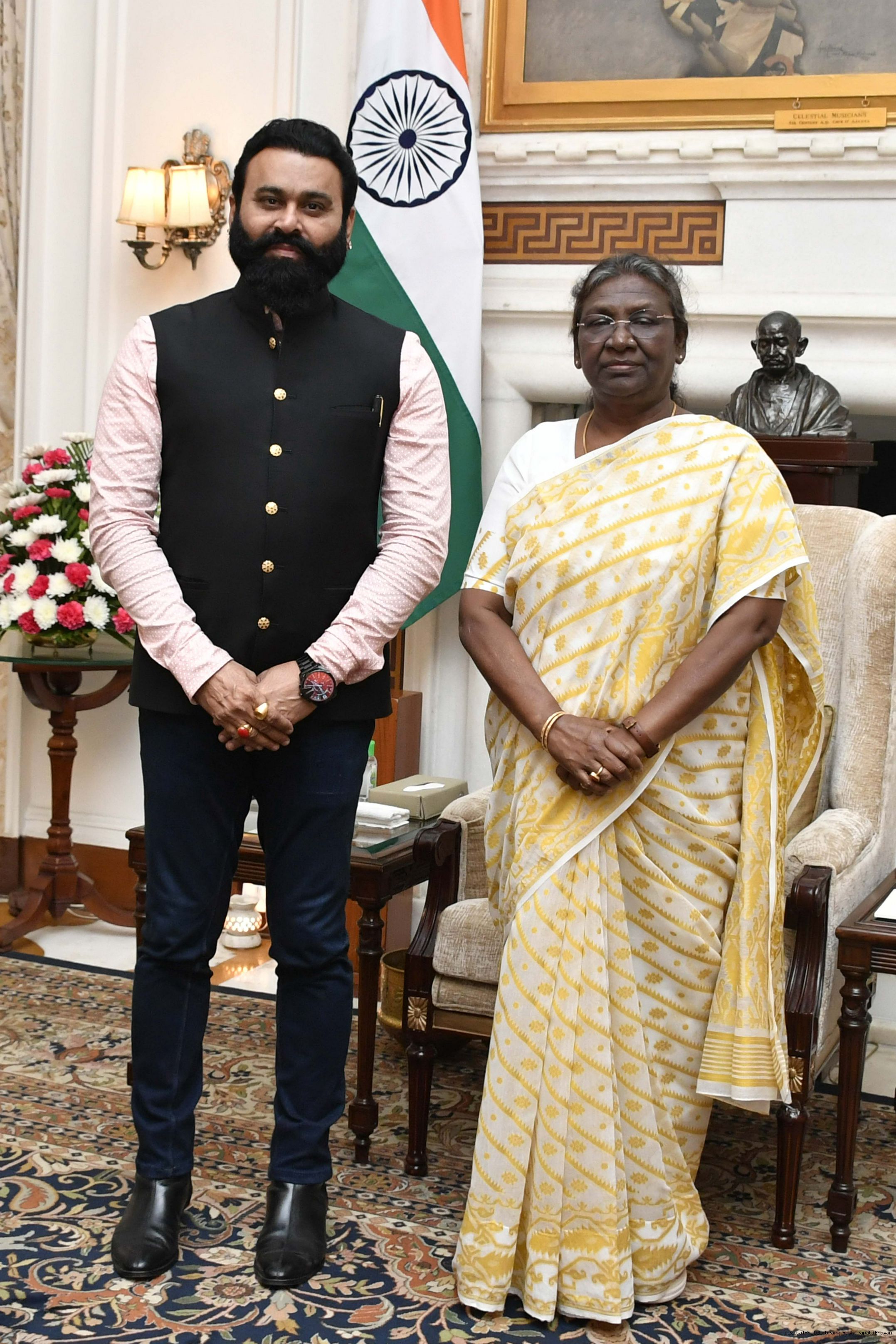 Prof. (Dr.) Arjunsinh Rana, Vice Chancellor, Swarnim Gujarat Sports University, Gandhinagar meeting with the President of India, Smt. Droupadi Murmu, at Rashtrapati Bhavan on Nov 09, 2022.