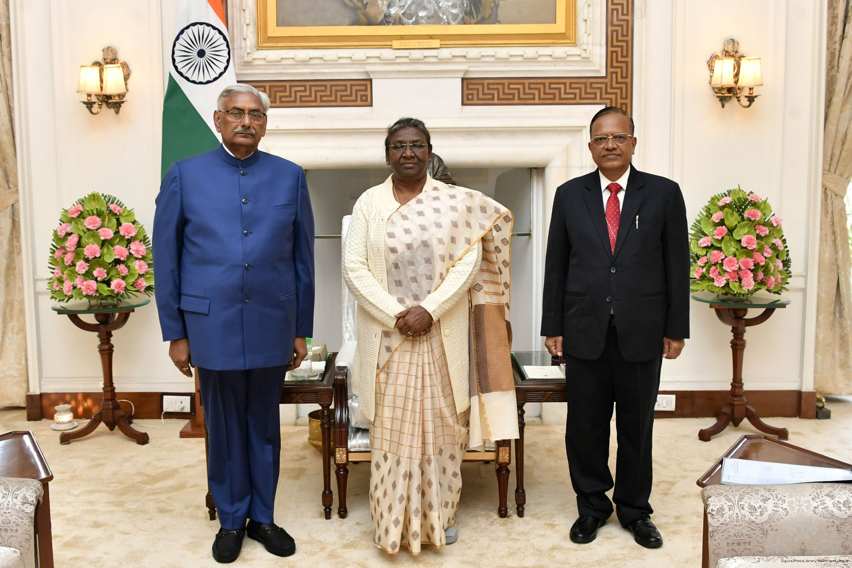 Shri Justice Arun Kumar Mishra, Chairperson and Shri D.K Singh, Secretary General, National Human Rights Commission meeting with the President of India, Smt. Droupadi Murmu, at Rashtrapati Bhavan on Dec 06, 2022.