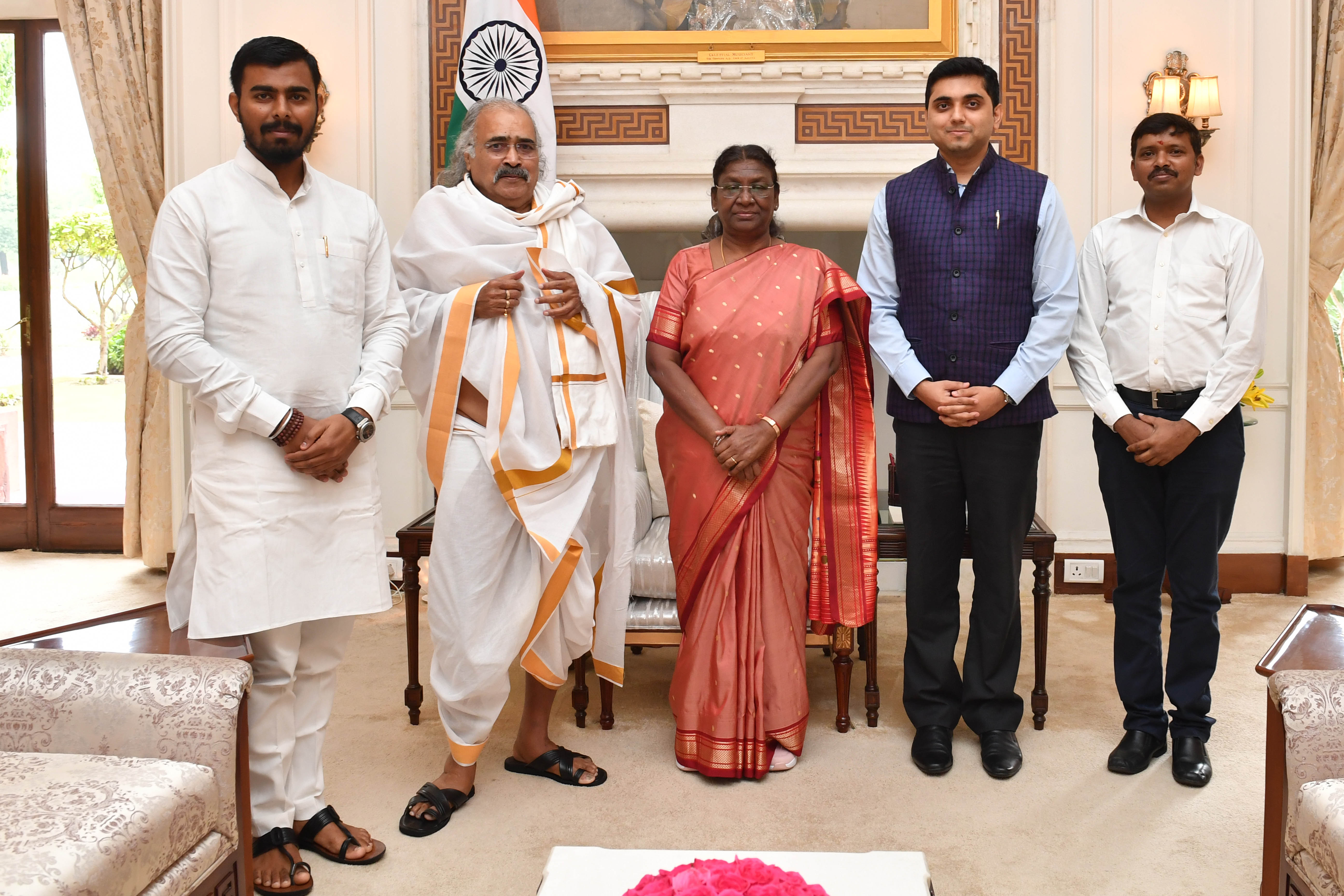 Shri Ashok Bhagat, Secretary, Vikas Bharti Bishnupur along with others meeting with the President of India, Smt. Droupadi Murmu at Rashtrapati Bhavan on July 10, 2023.