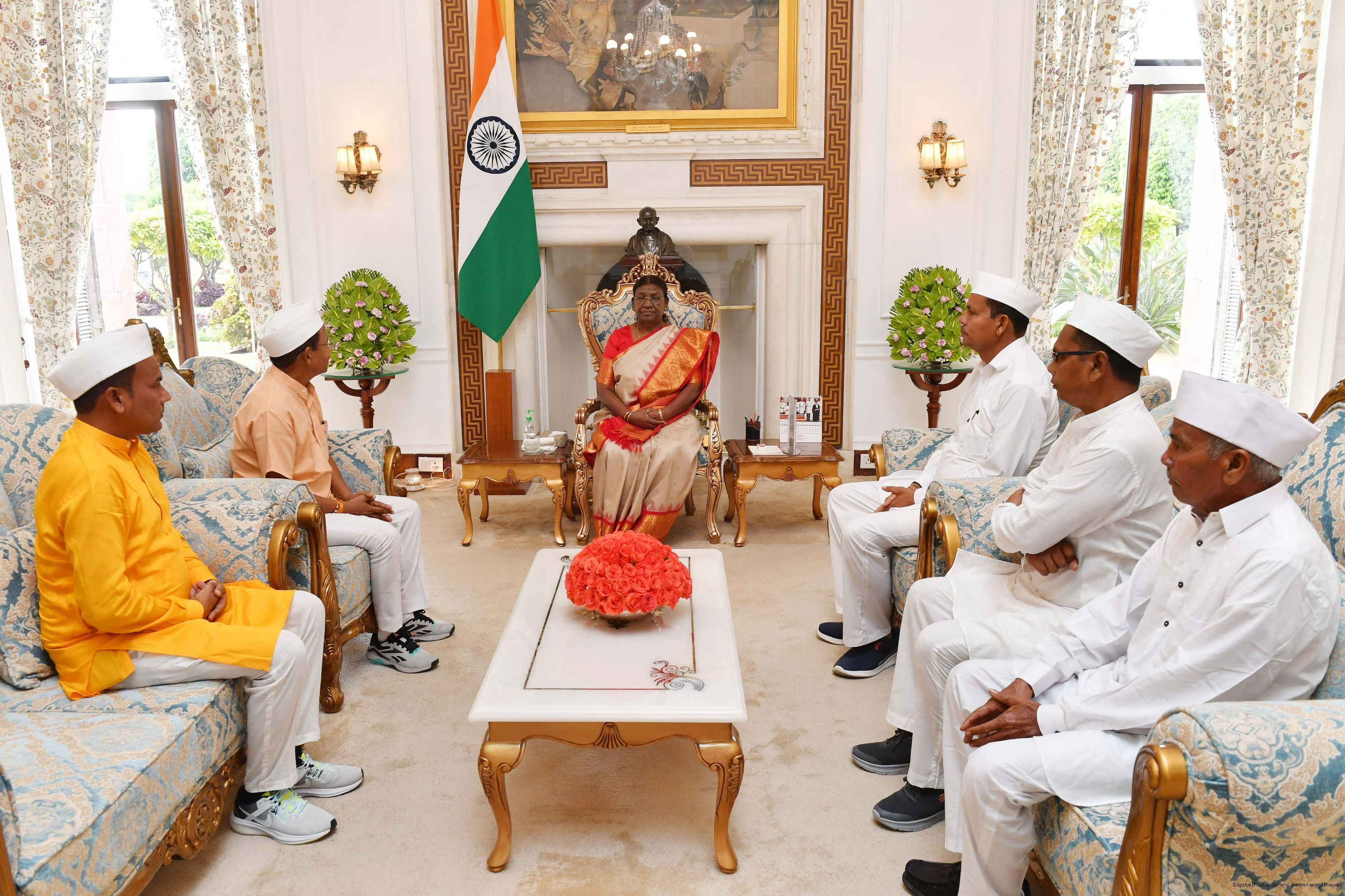 Shri Babu Singh Tomar, President, Buksa Janjati Kalyan Samiti along with others meeting with the President of India, Smt. Droupadi Murmu at Rashtrapati Bhavan on September 06, 2023.