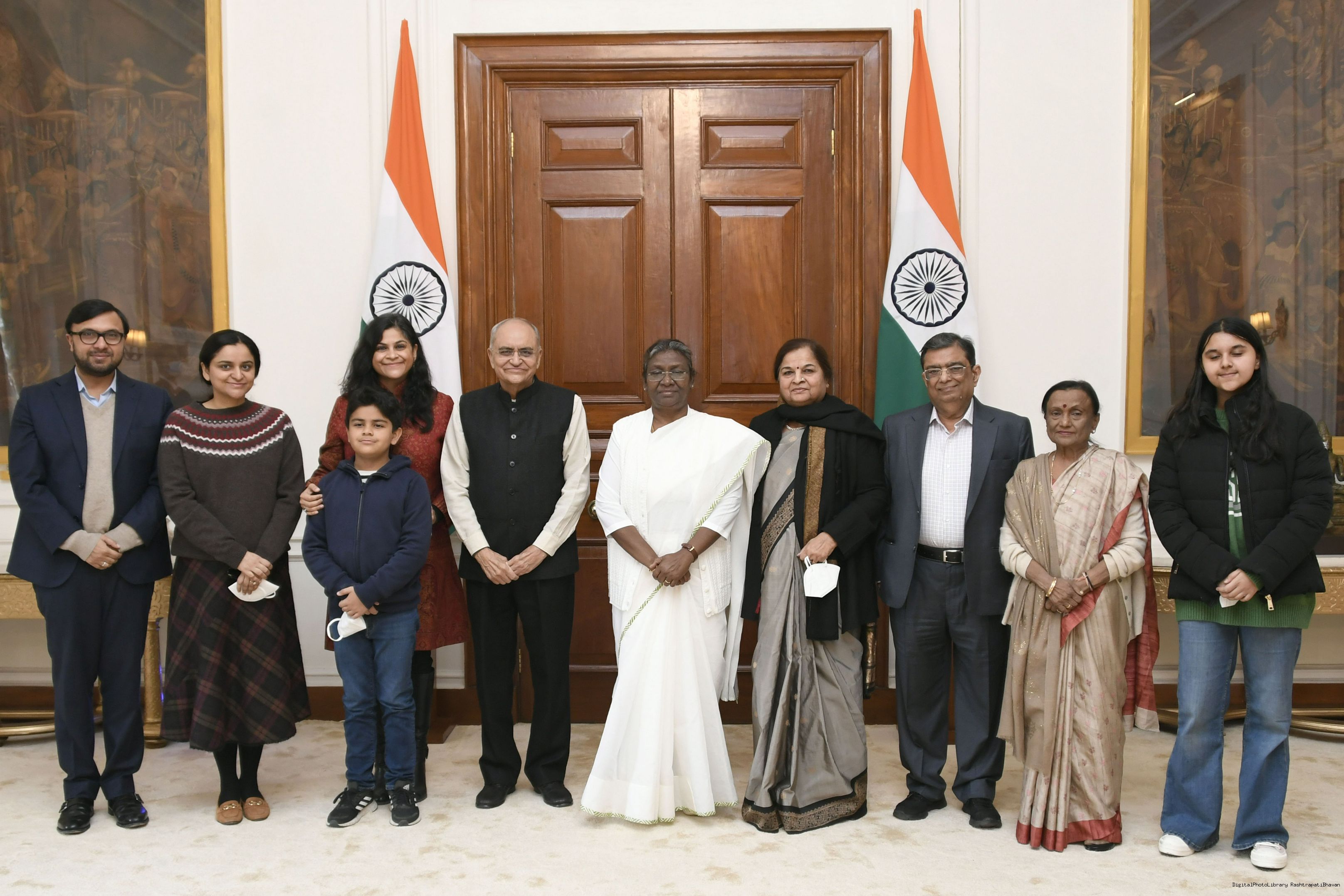 Shri Balbir Punj, ex. MP (Rajya Sabha) along with his family members meeting with the President of India, Smt. Droupadi Murmu, at Rashtrapati Bhavan on Dec 24, 2022.