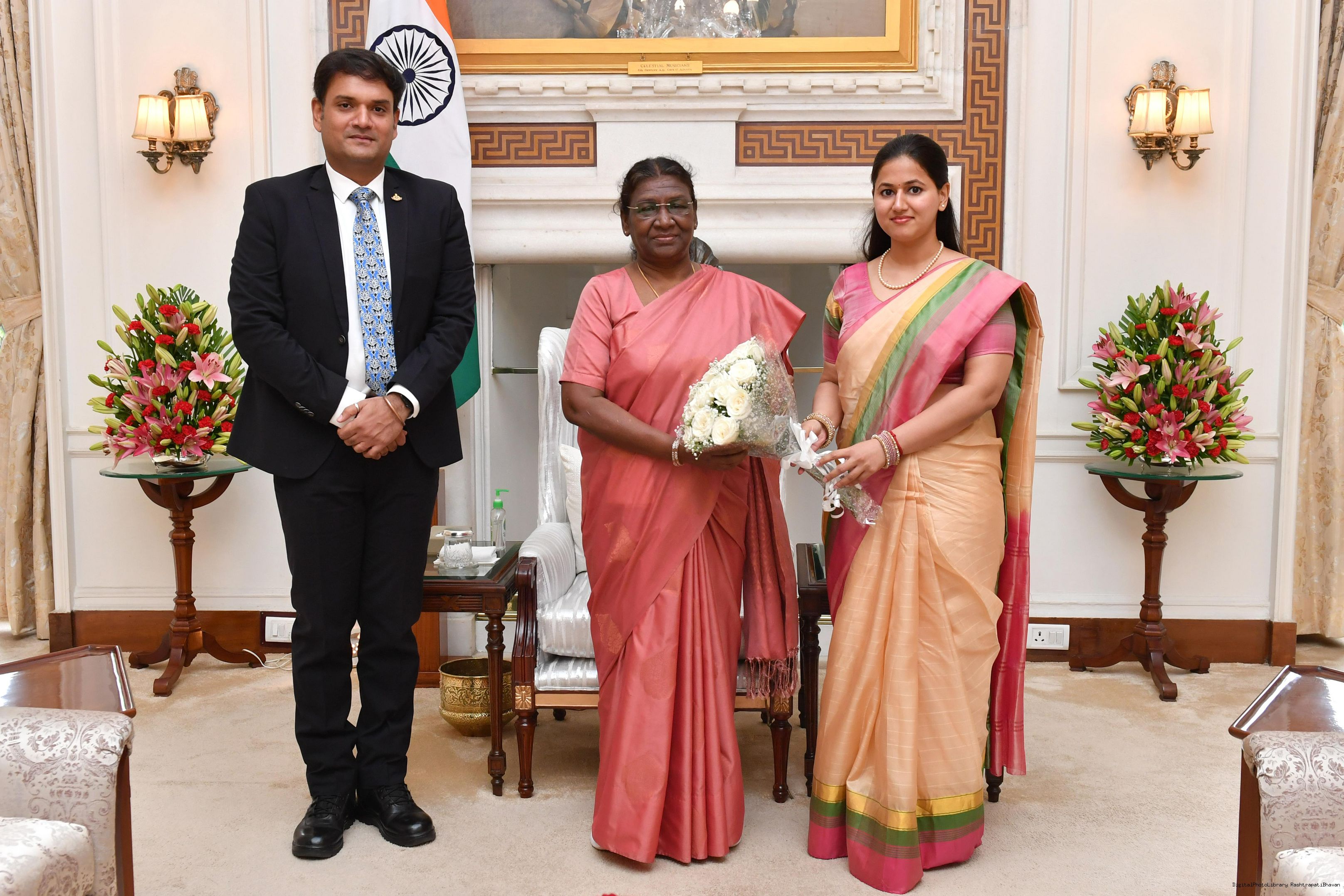 Shri Balram, Addl DCP, PSO to the President along with his wife Mrs. Apoorva Gupta meeting with the President of India, Smt. Droupadi Murmu at Rashtrapati Bhavan on July 11, 2023.