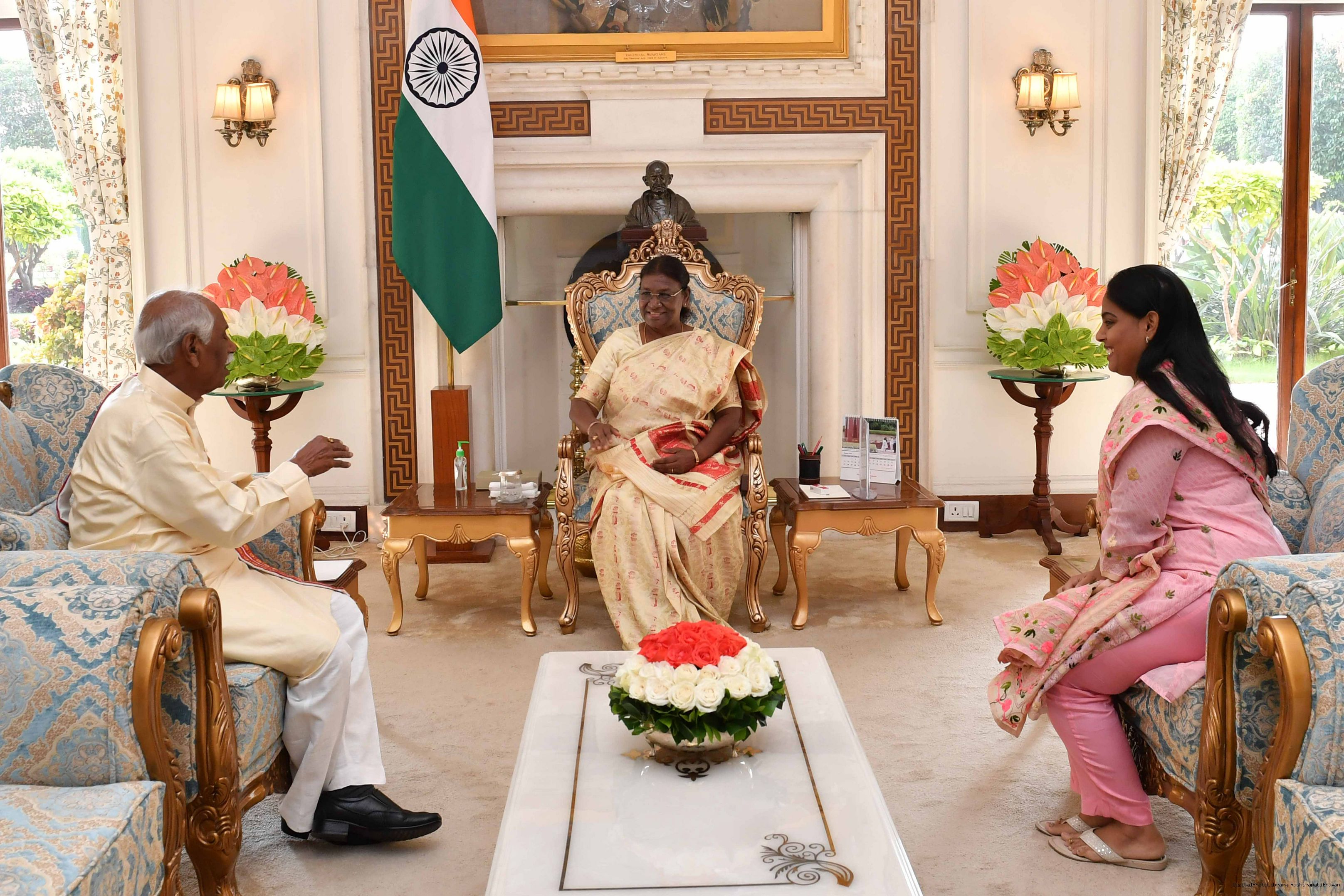 The Governor of Haryana, Shri Bandaru Dattatraya along with his Daughter Smt. Bandaru Vijayalaxmi called on the President of India, Smt Droupadi Murmu at Rashtrapati Bhavan on August 16, 2023.