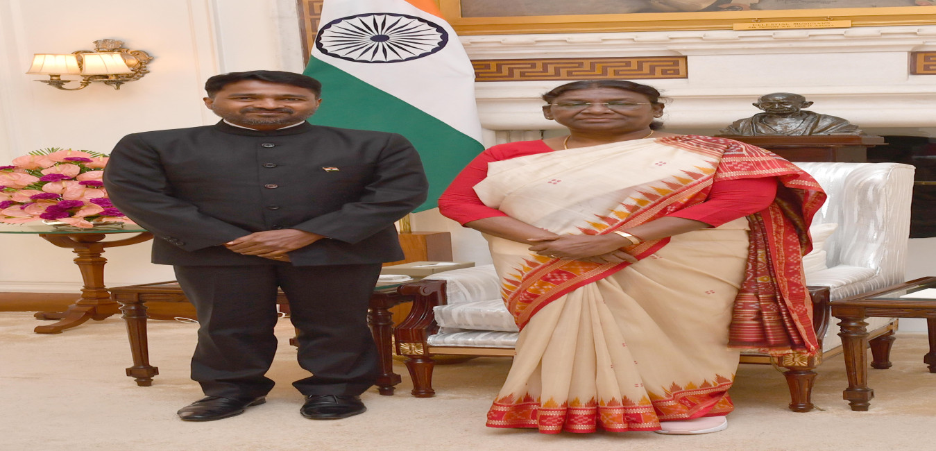 The High Commissioner-designate of India to the Republic of Botswana, Shri Bharath Kumar Kuthati meeting with the President of India, Smt. Droupadi Murmu at Rashtrapati Bhavan on July 17, 2023.