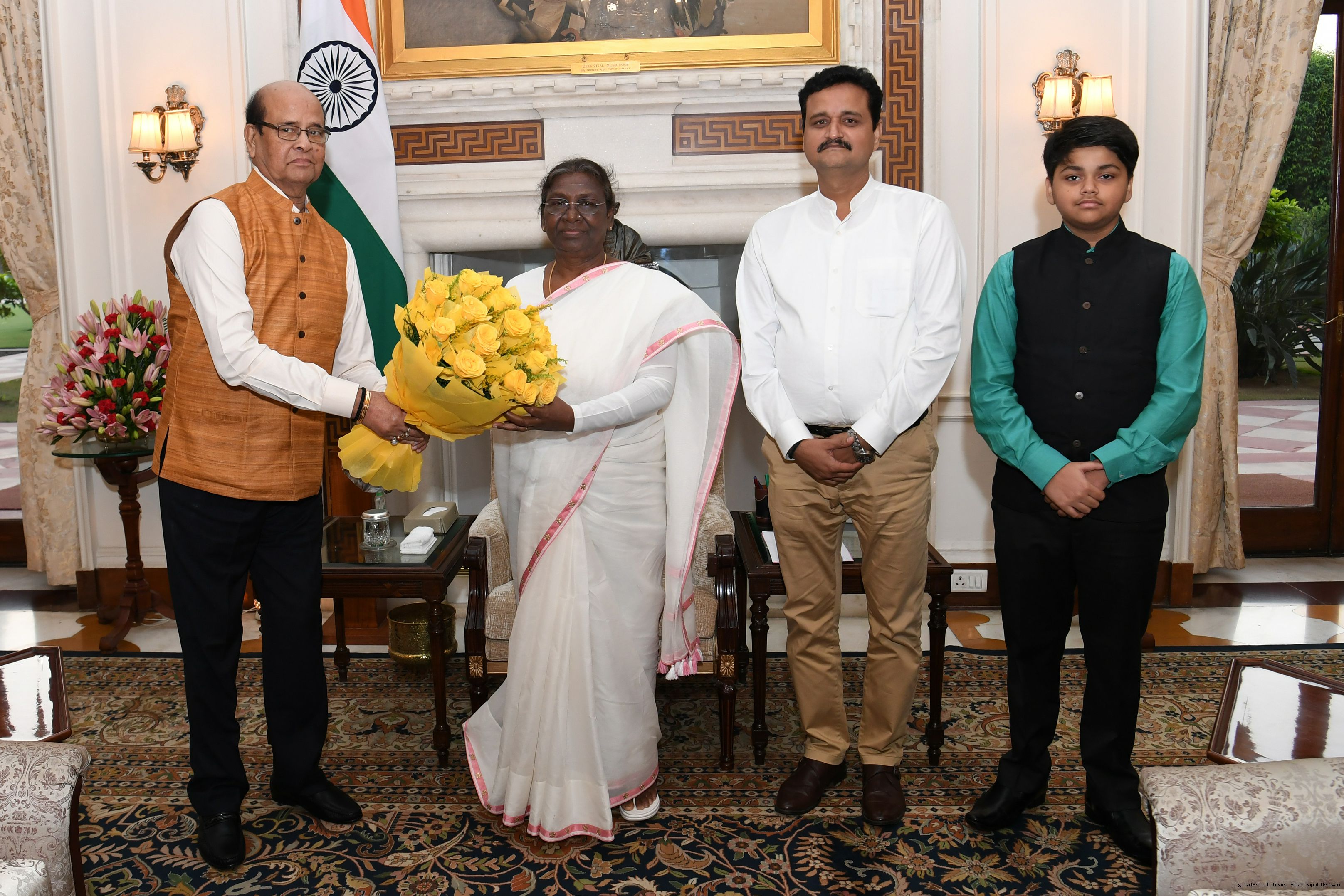 Shri Bijay Shanker Shukla, Shri Shashi Shanker Shukla Shri Uday Shanker Shukla and Shri Subodh meeting with the President of India, Smt. Droupadi Murmu, at Rashtrapati Bhavan on Oct 01, 2022.