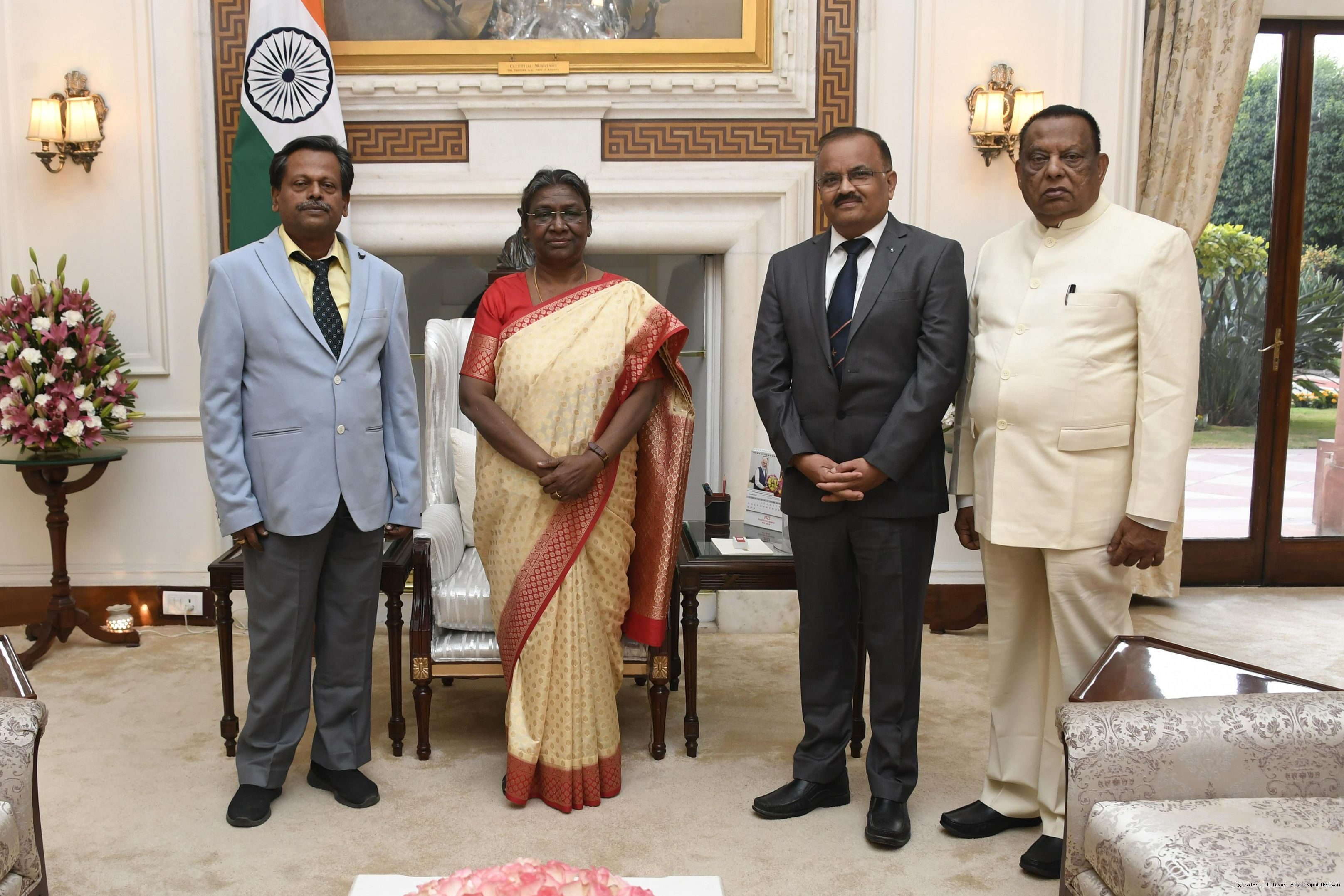 Shri Bikram Keshari Mishra, General Manager, Bank of India, Odisha alsong with others meeting with the President of India, Smt. Droupadi Murmu, at Rashtrapati Bhavan on February 28, 2023.