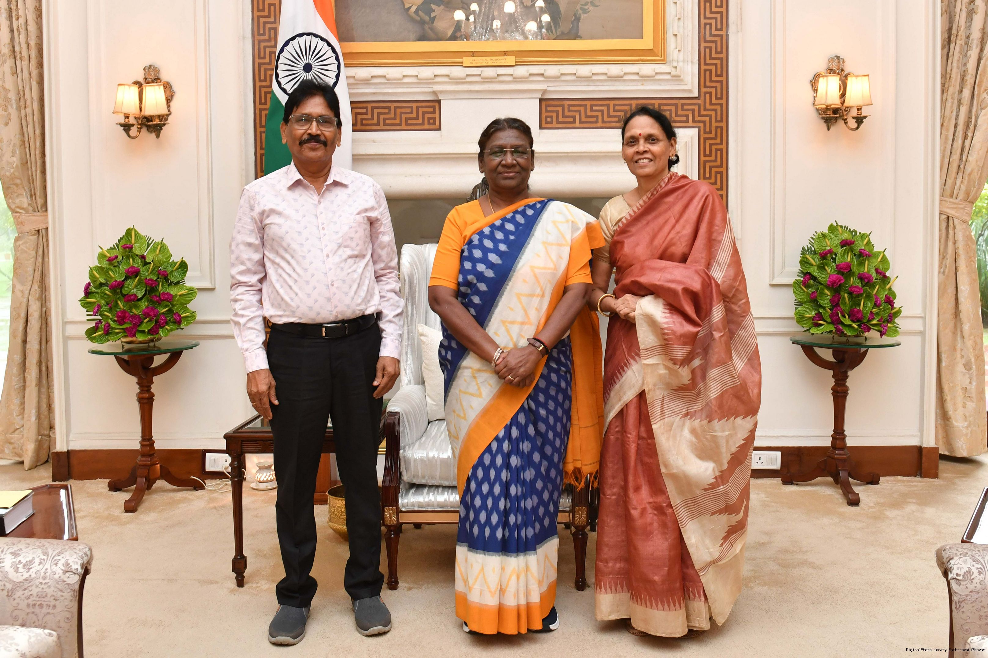 Shri Chandan Bhuya along with others meeting with the President of India, Smt. Droupadi Murmu at Rashtrapati Bhavan on June 30, 2023.