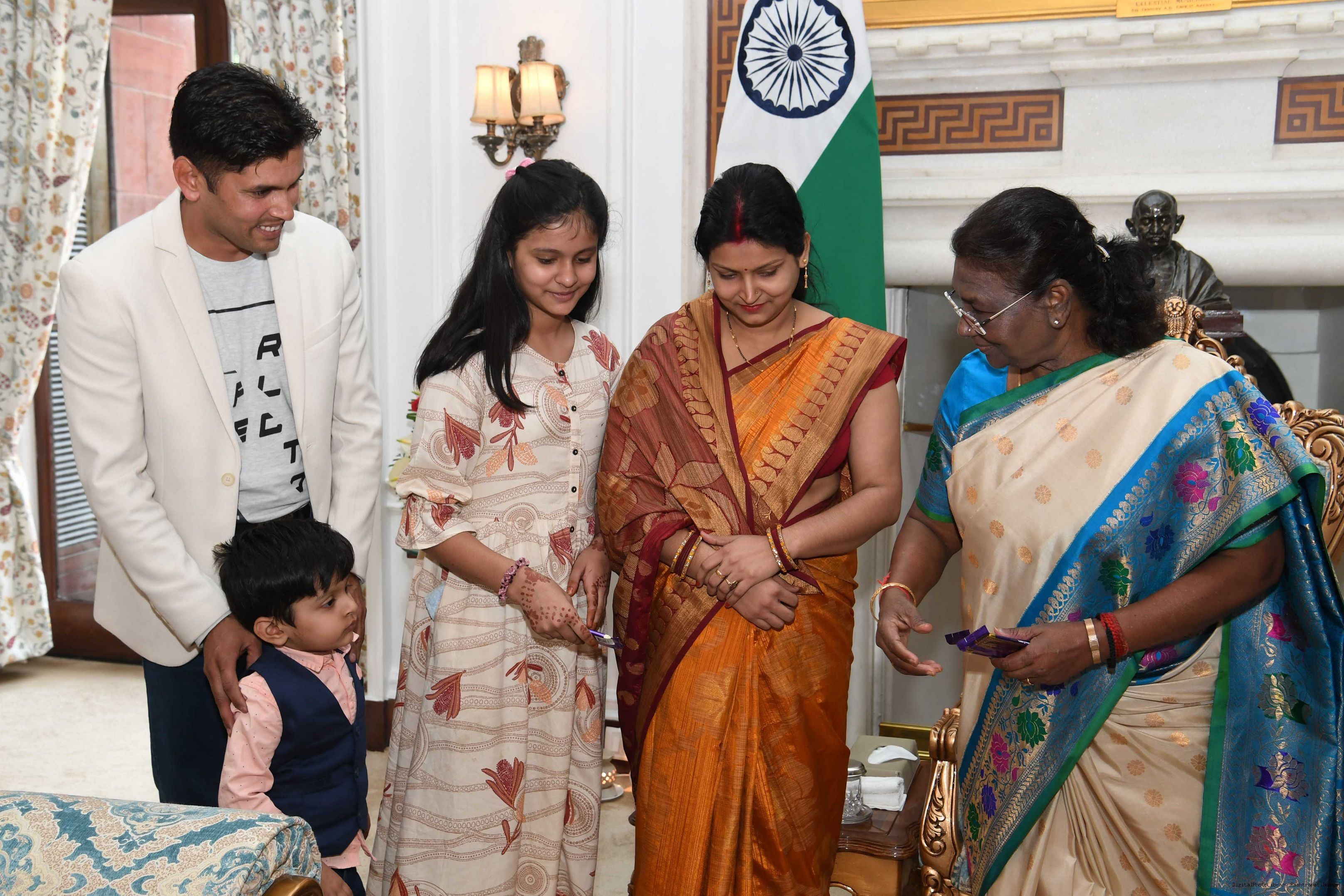 Shri Chandan Kumar from Rairangpur along with Smt Madhu Kumari Ms Aaradhya Kumari Master Darsh Sharma Shri Rajesh kumar Kumar Smt Sumita and master Aryam meeting with the President of India Smt. Droupadi Murmu at Rashtrapati Bhavan on November 15, 2023