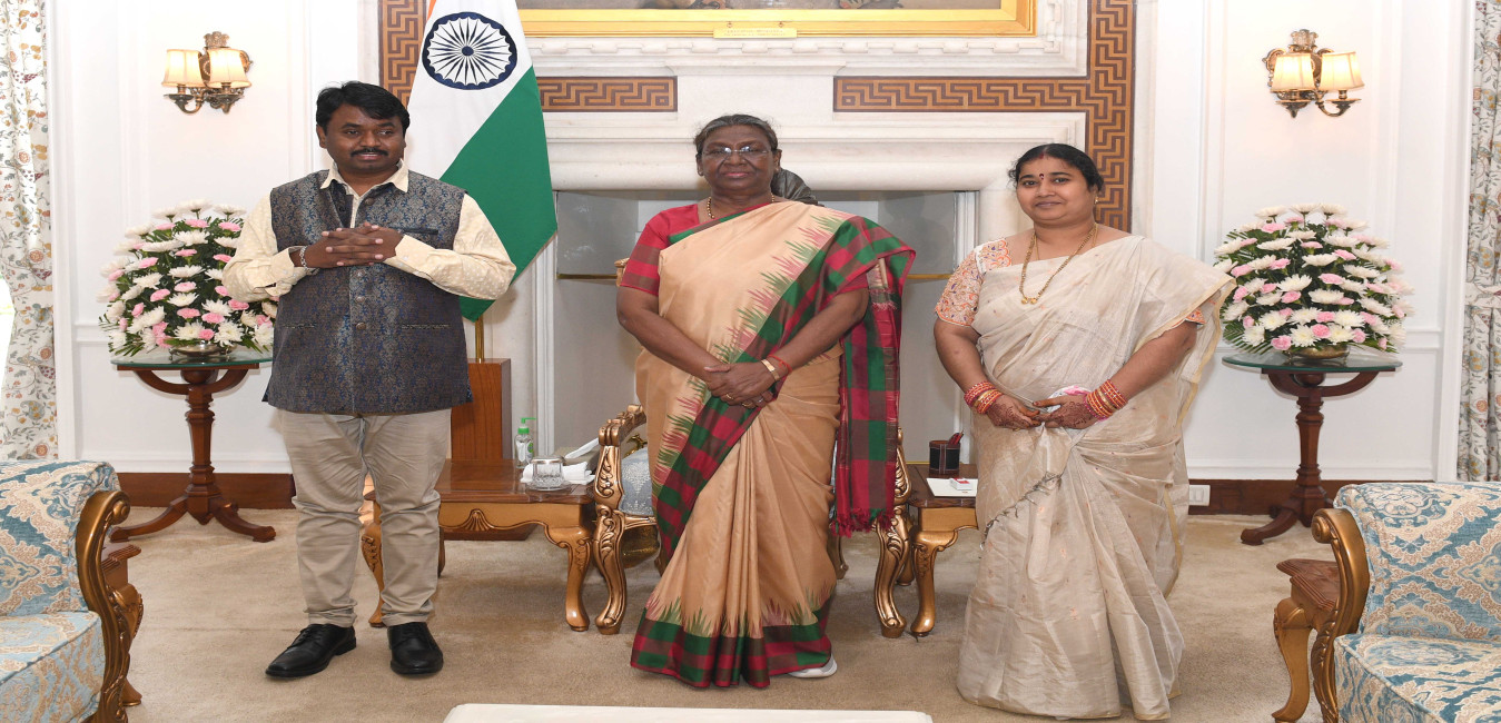 Shri Chenna Sarat Babu, Advocate, Supreme Court of India along with his wife Smt. Chenna Karuna meeting with the President of India Smt Droupadi Murmu at Rashtrapati Bhavan on April 16, 2024.