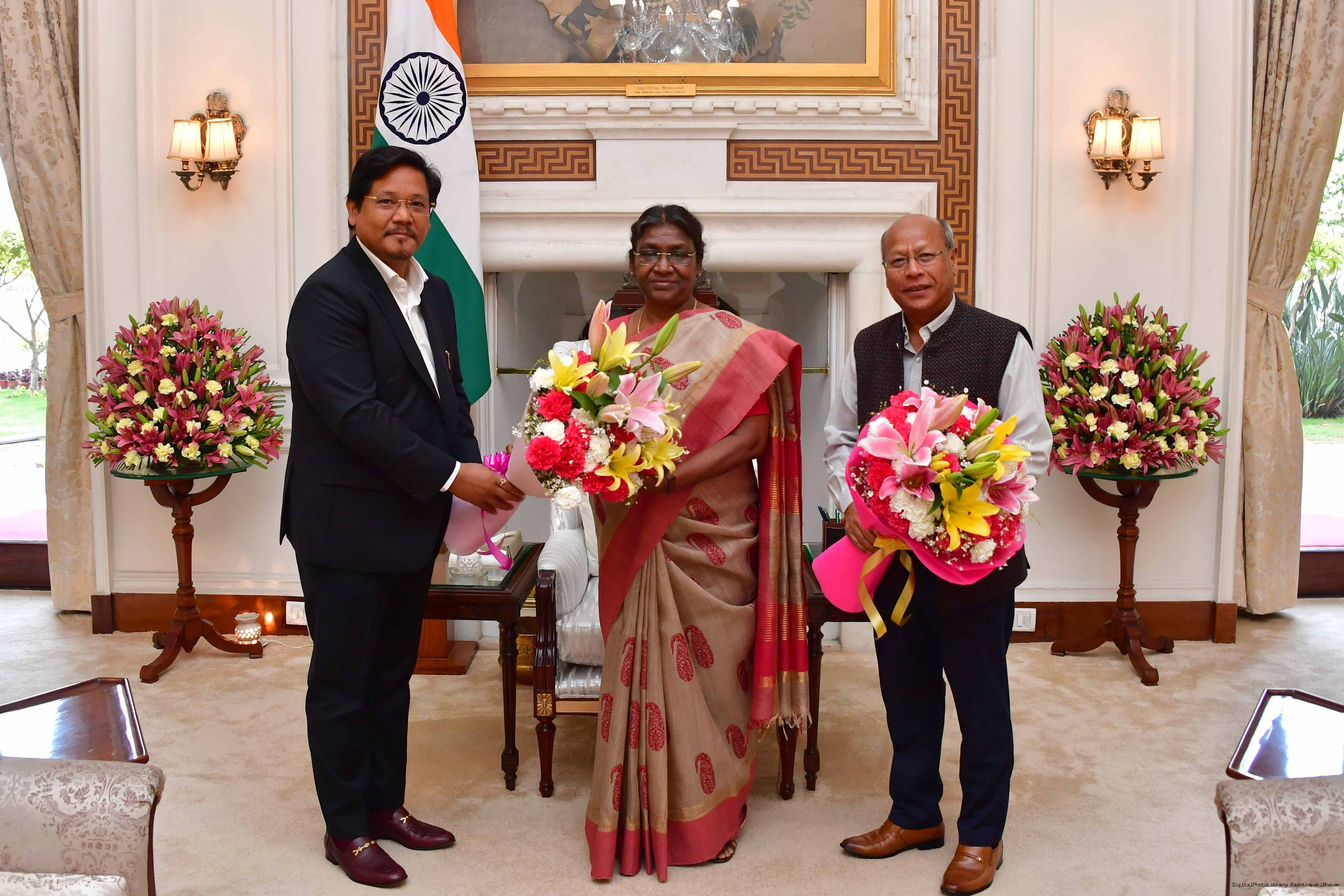 The Chief Minister of Meghalaya, Shri Conrad Kongkal Sangma and the Deputy Chief Minister, Shri Prestone Tynsong called on the President of India Smt. Droupadi Murmu at Rashtrapati Bhavan on March 11, 2023.