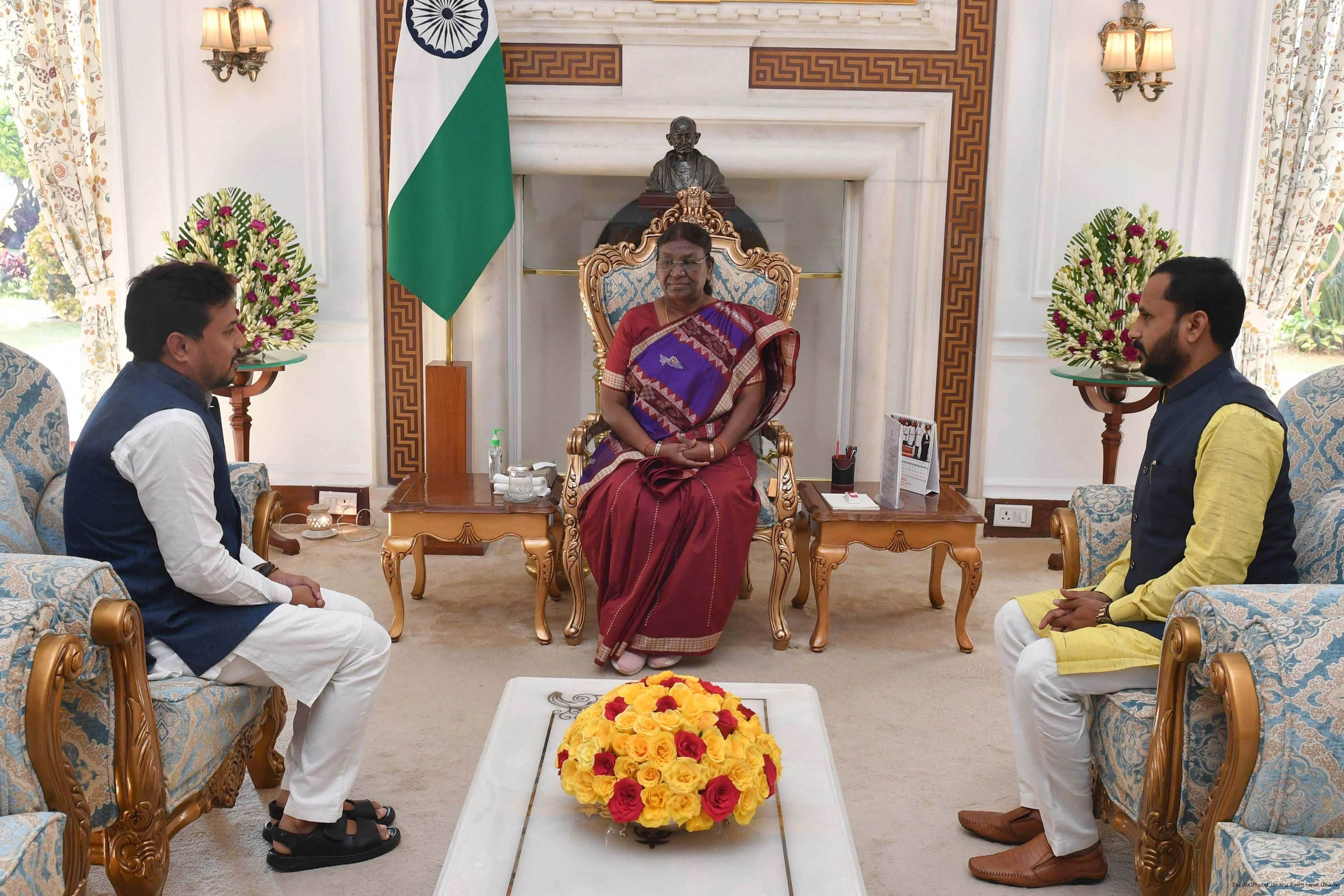 Shri Deepjyoti Mund, National Executive Member and Chattisgarh State Co Inchage, BJP Yuva Morcha along with others meeting with the President of India, Smt. Droupadi Murmu at Rashtrapati Bhavan on September 19, 2023.