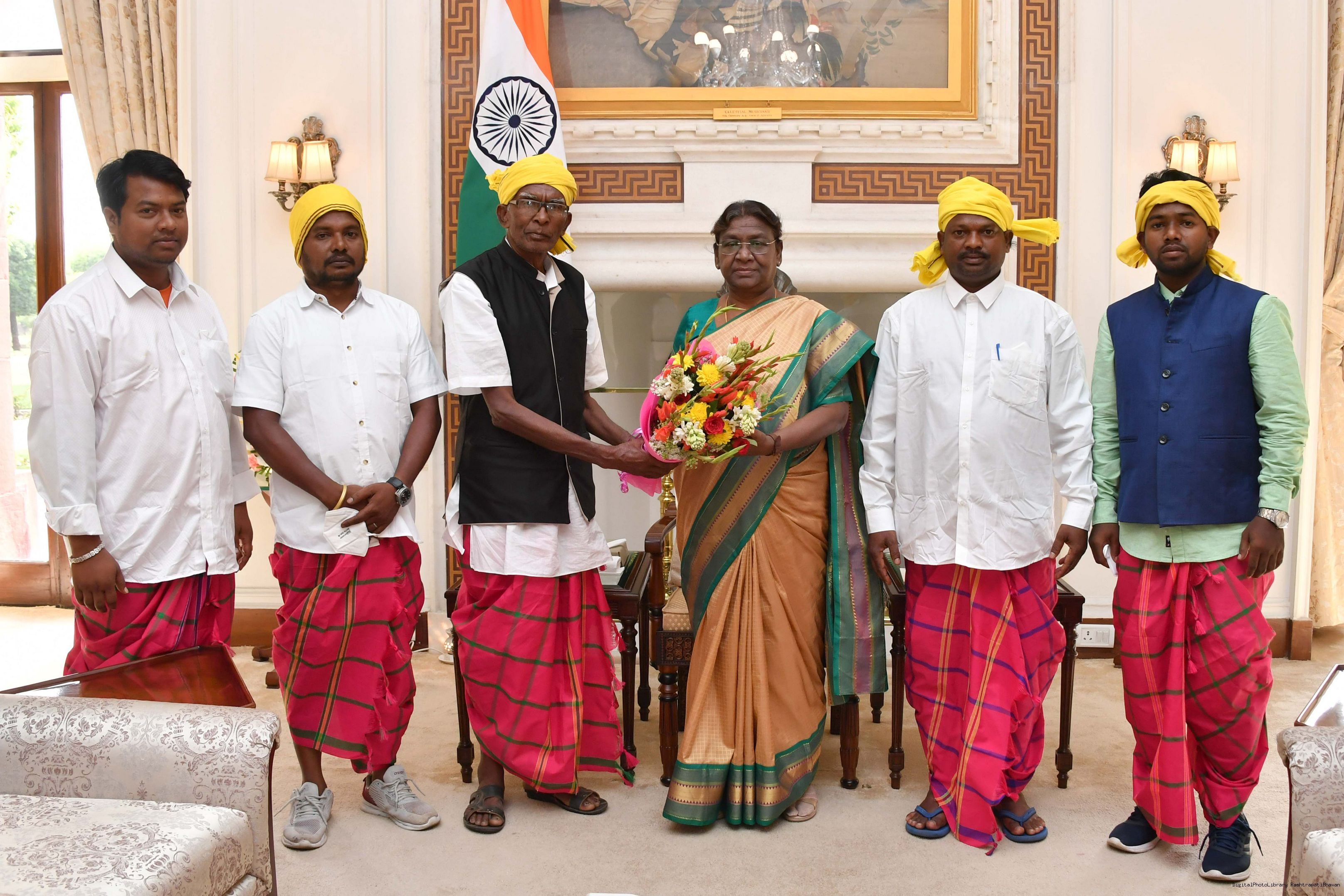 Shri Dhanga Hansda, along with others, from Bharat Jakat Majhi Pargana Mahal (BJMPM), Jhargram, West Bengal meeting with the President of India, Smt. Droupadi Murmu at Rashtrapati Bhavan on May 22, 2023