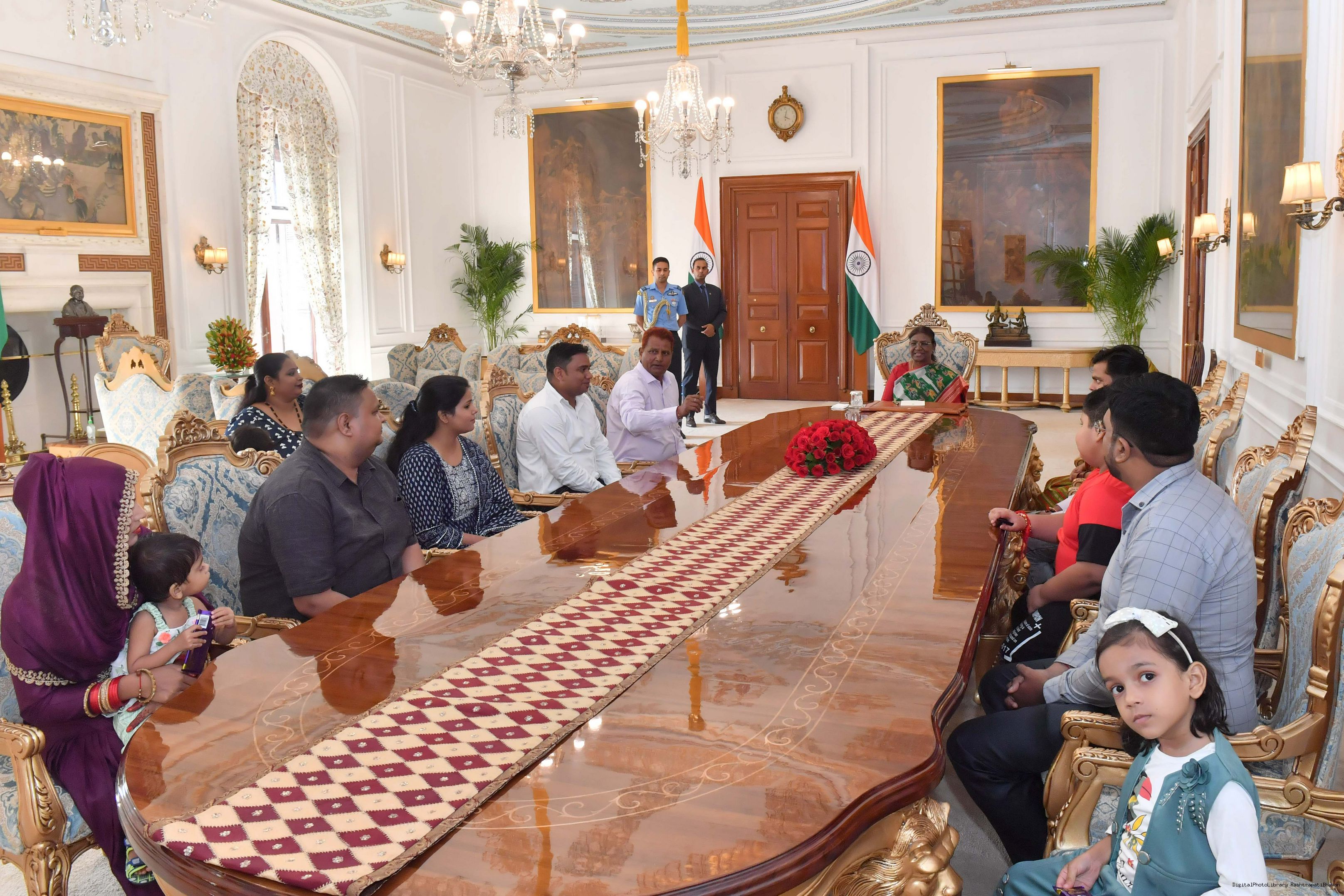Shri Dharampal, Senior Mali along with others meeting with the President of India, Smt. Droupadi Murmu at Rashtrapati Bhavan on August 30, 2023.
