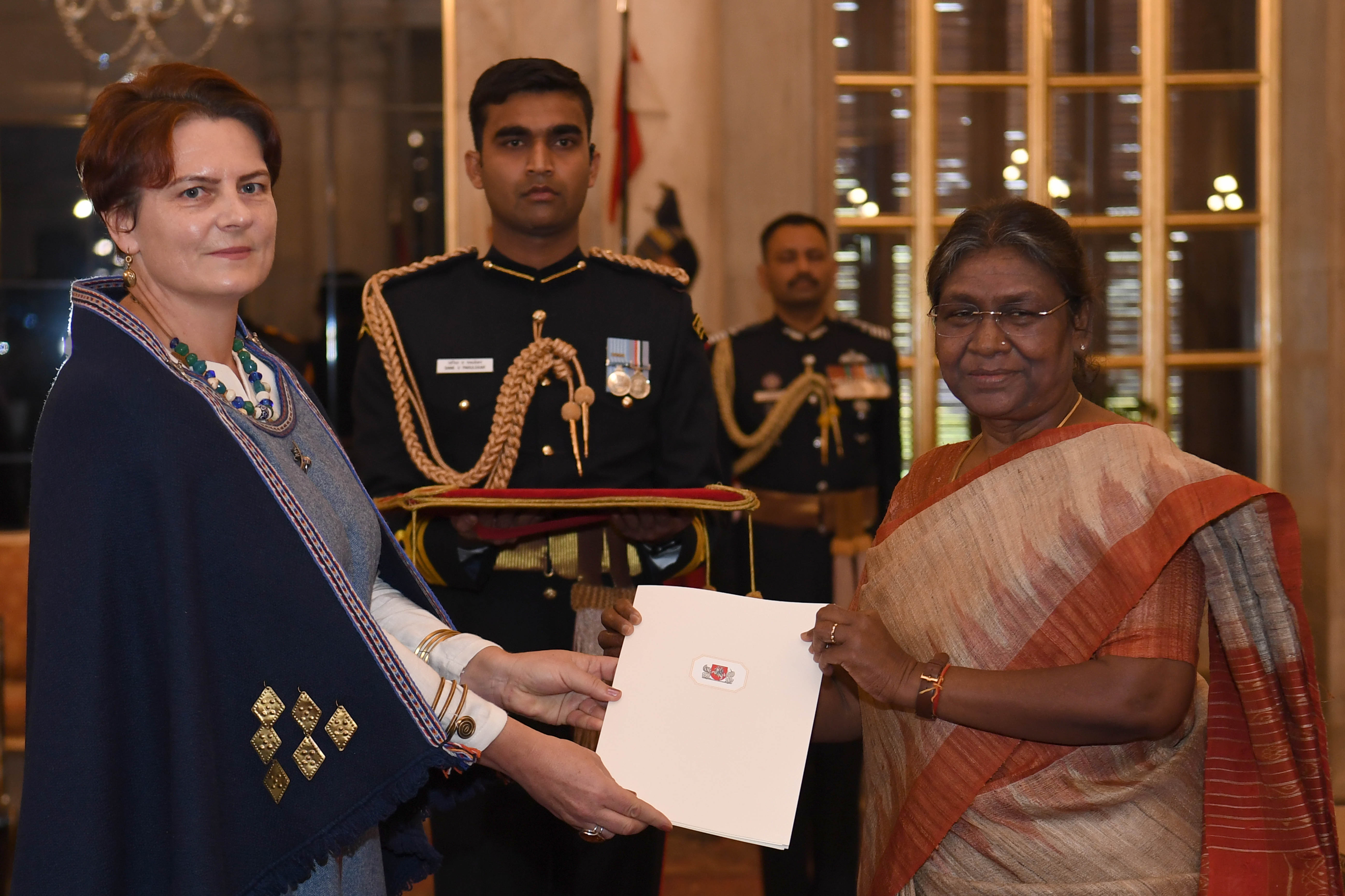 The Ambassador of the Republic of Lithuania, H.E. Mrs. Diana Mickeviciene presenting her credentials to the President of India, Smt. Droupadi Murmu, at Rashtrapati Bhavan on February 15, 2023.