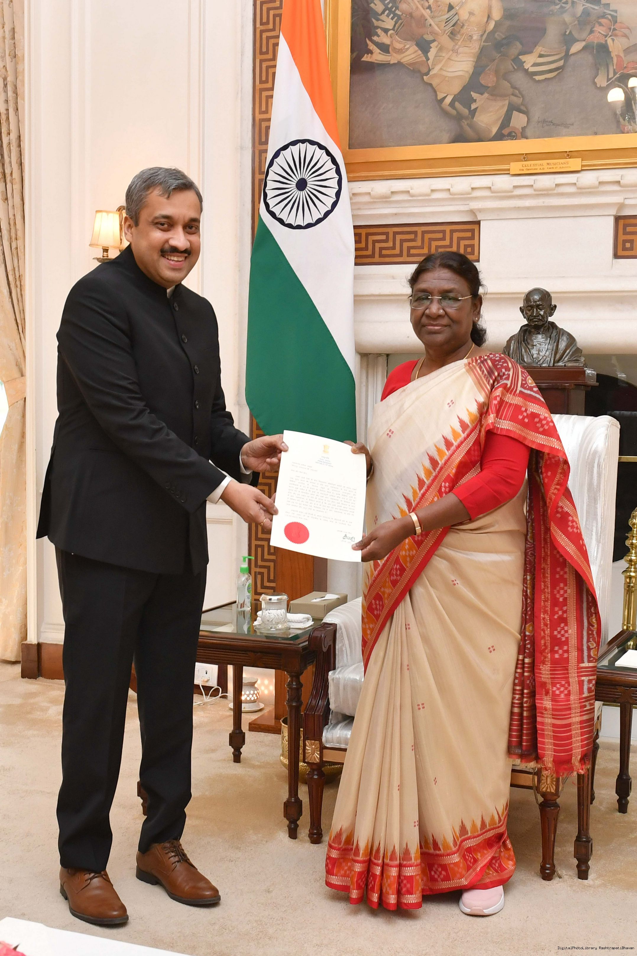 The High Commissioner-designate of India to Singapore, Dr. Shilpak Ambule meeting with the President of India, Smt. Droupadi Murmu at Rashtrapati Bhavan on July 17, 2023.