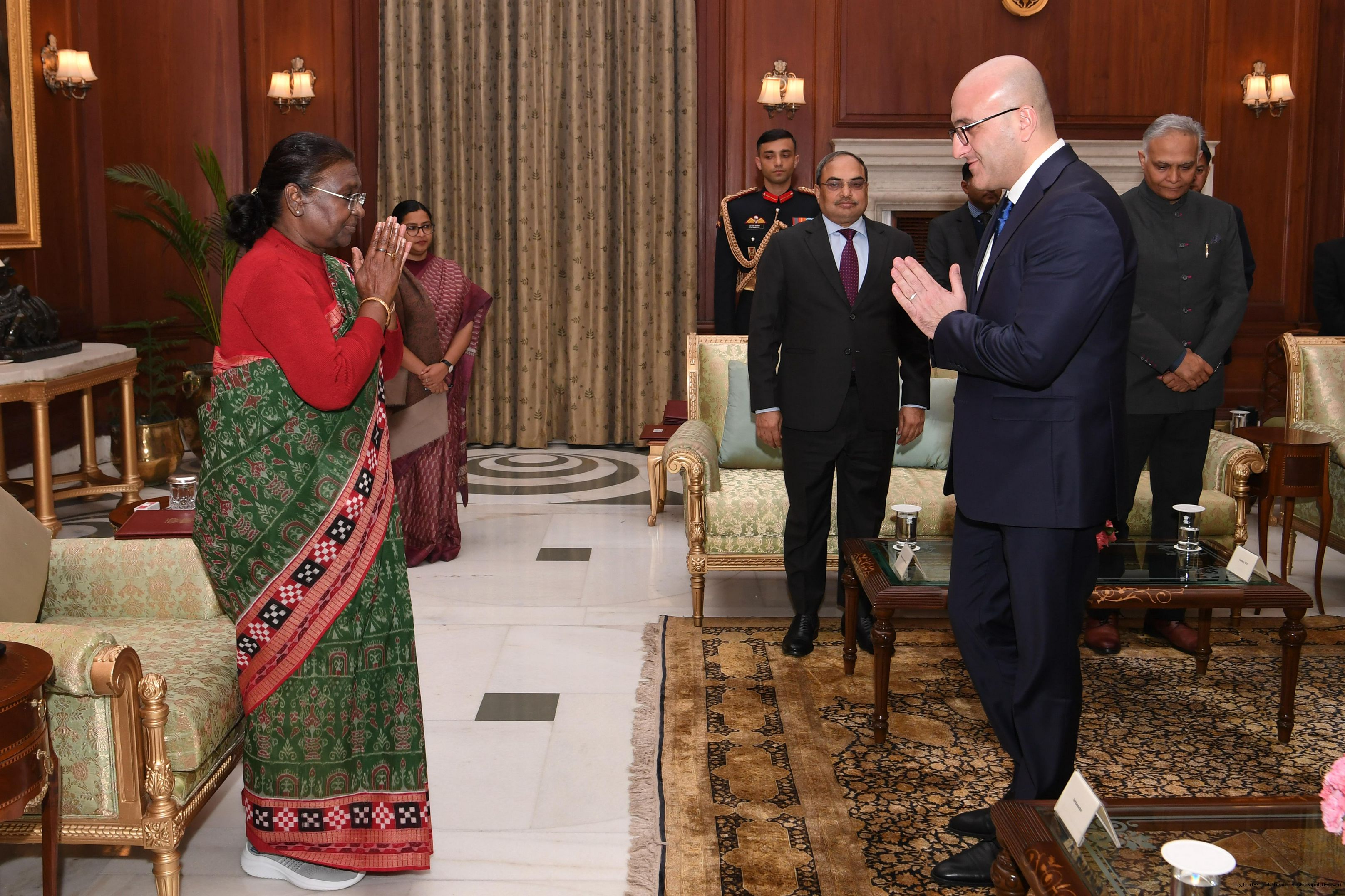 The Ambassador-designate of the Republic of Azerbaijan, H.E. Mr. Elchin Nariman Oglu Huseynli presenting his credentials to the President of India, Smt Droupadi Murmu at Rashtrapati Bhavan on January 5, 2024.