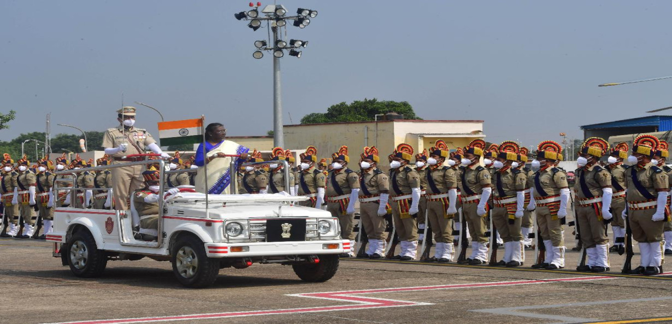The President of India, Smt. Droupadi Murmu being received by the Governor of Odisha, Prof. Ganeshi Lal, the Chief Minister, Shri Naveen Patnaik and the Union Education Minister, Shri Dharmendra Pradhan, on her arrival in Bhubaneswar on November 10, 2022. The President was accorded a guard of honour on her first visit to Odisha.