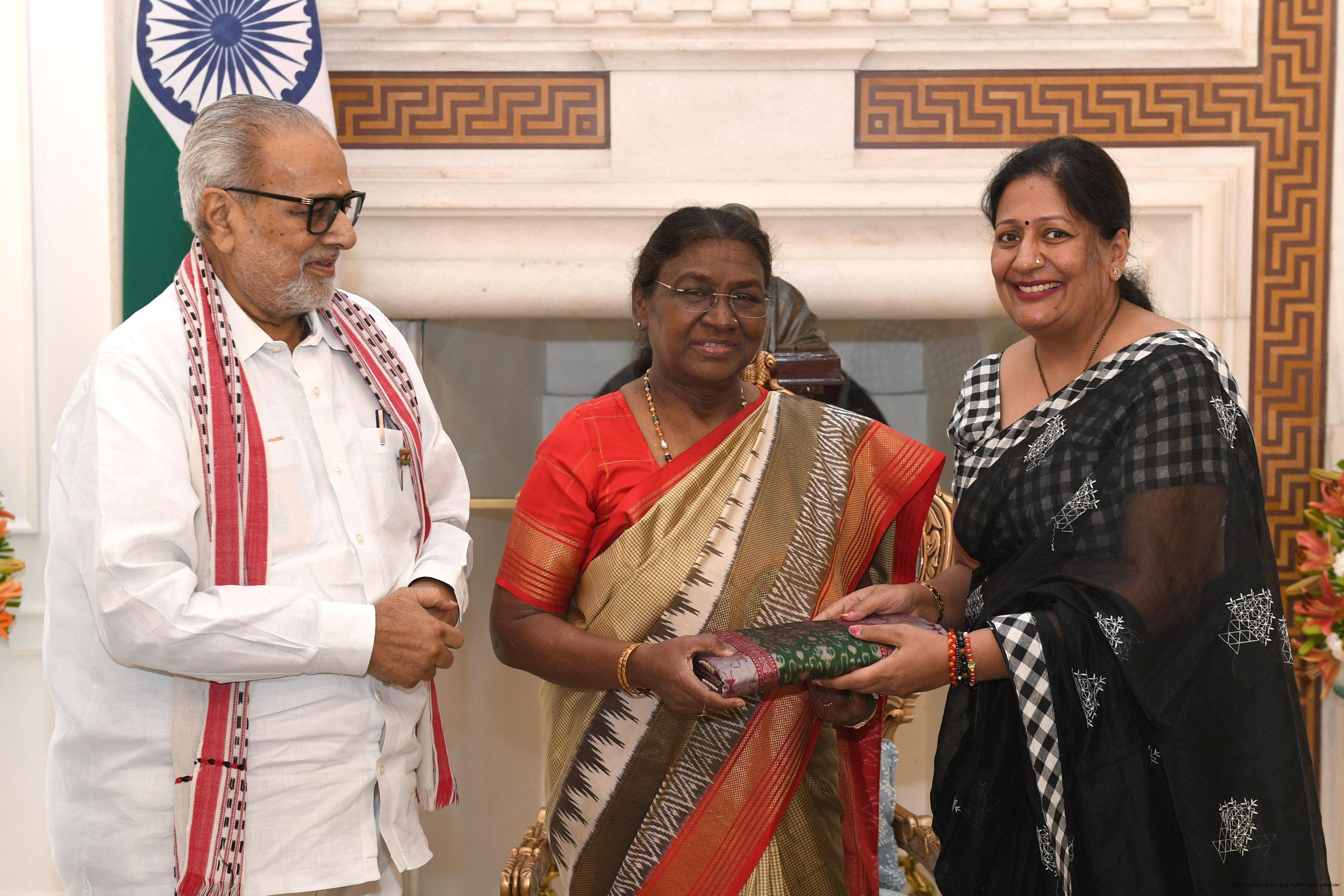 Prof. Ganeshi Lal, Former Governor of Odisha along with others meeting with the President of India Smt. Droupadi Murmu at Rashtrapati Bhavan on August 20, 2024.