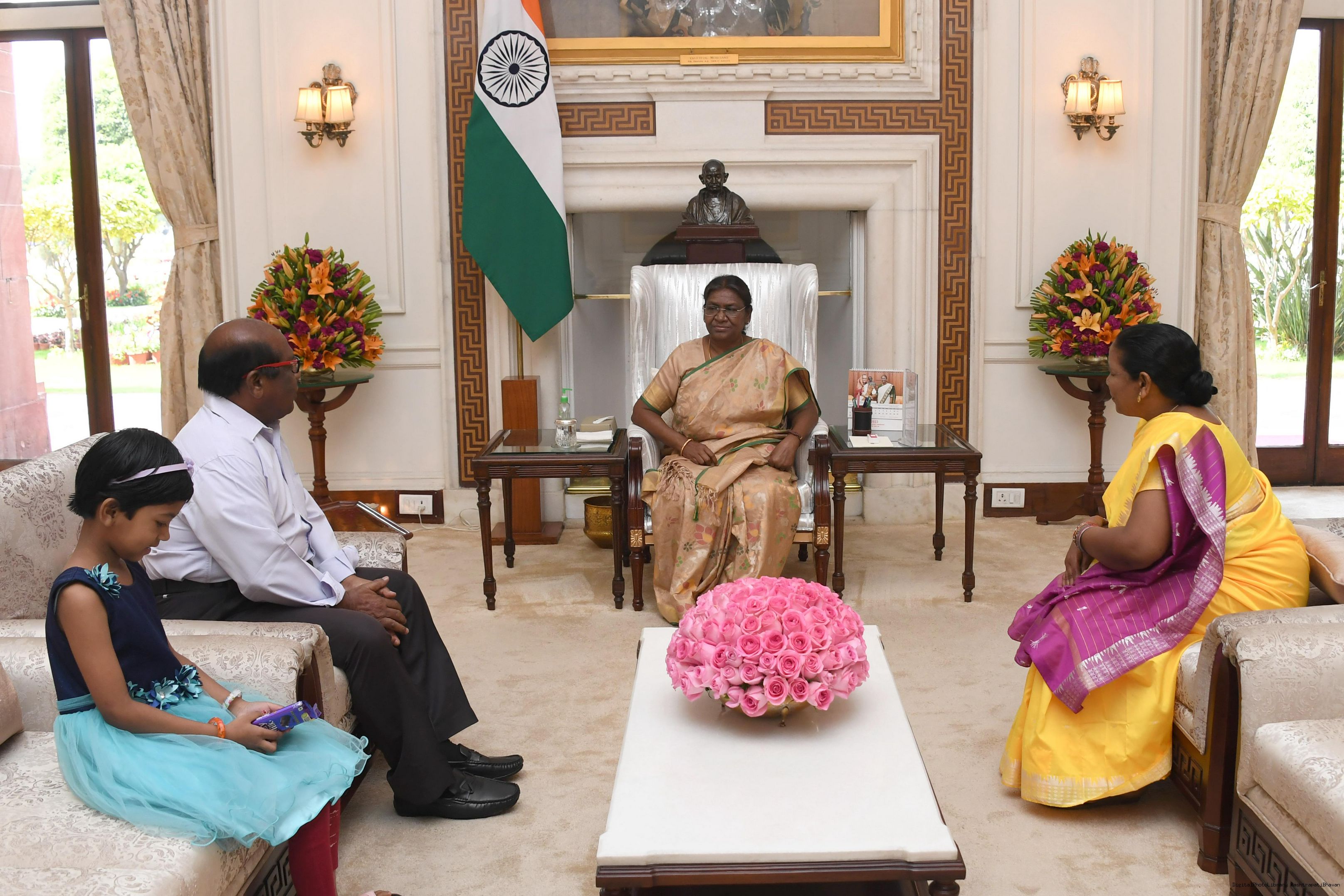 Shri Gaura Mohan Murmu of Baripada, Odisha along with his wife Smt. Salge Murmu and grand-daughter Ms. Alisha Murmu meeting with the President of India, Smt. Droupadi Murmu, at Rashtrapati Bhavan on March 15, 2023