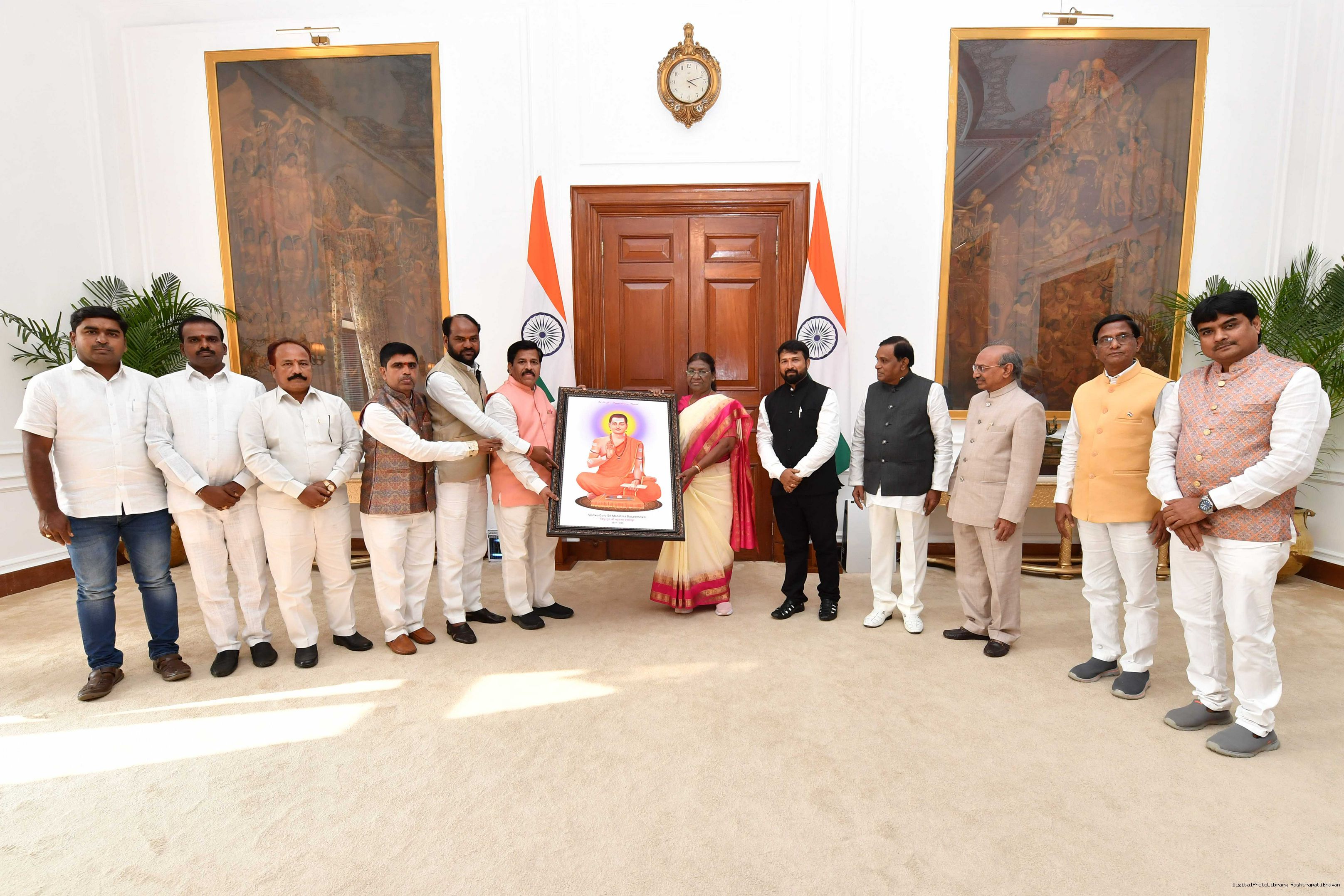 Shri Girapnore Dinesh Patil, State Treasurer, Lingayath Linga Balija Sangham, Telagana State along with others meeting with the President of India, Smt. Droupadi Murmu at Rashtrapati Bhavan on September 14, 2023.