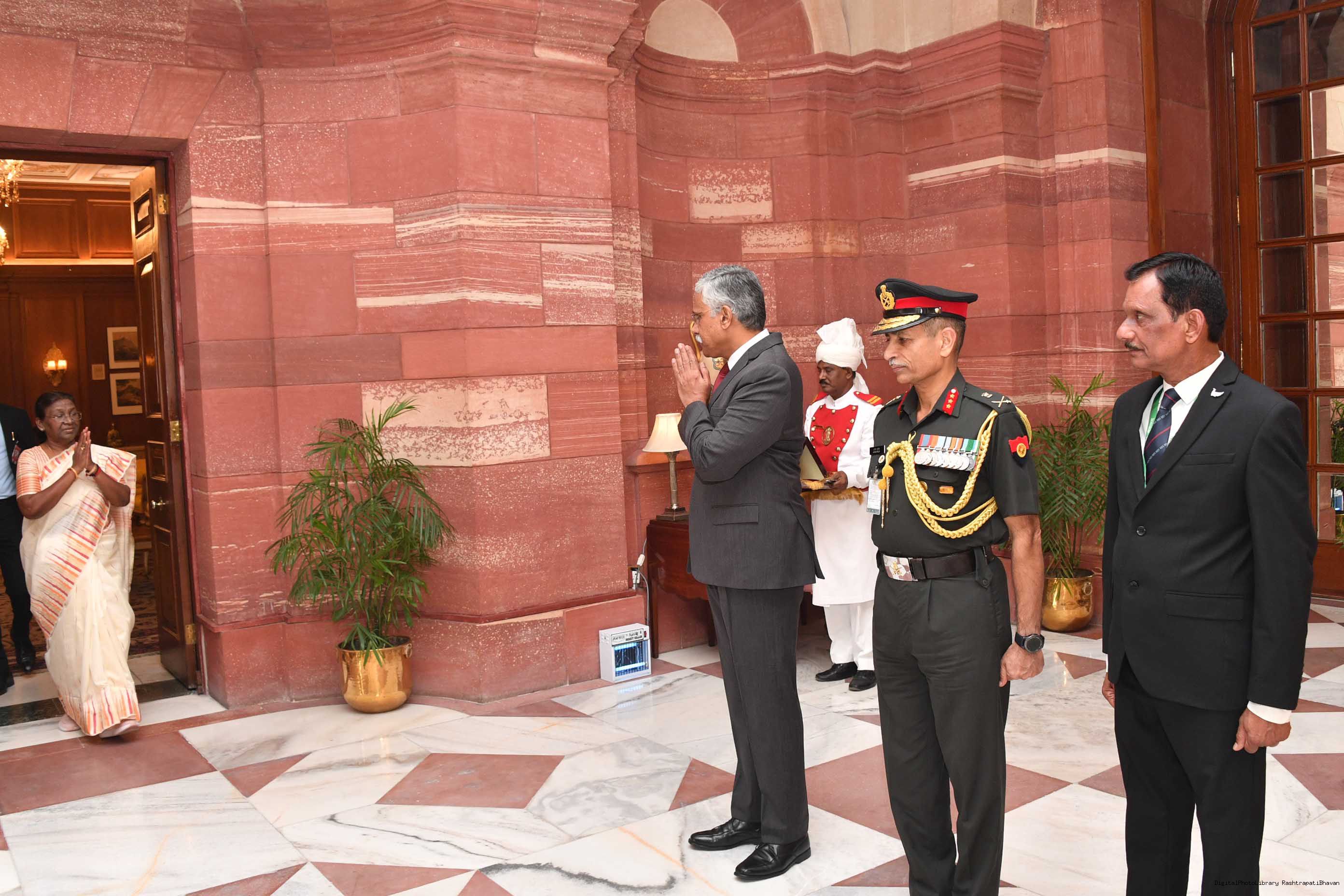 Shri Giridhar Aramane, Defence Secretary along with others meeting with President of India Smt. Droupadi Murmu at Rashtrapati Bhavan on July 12, 2024.