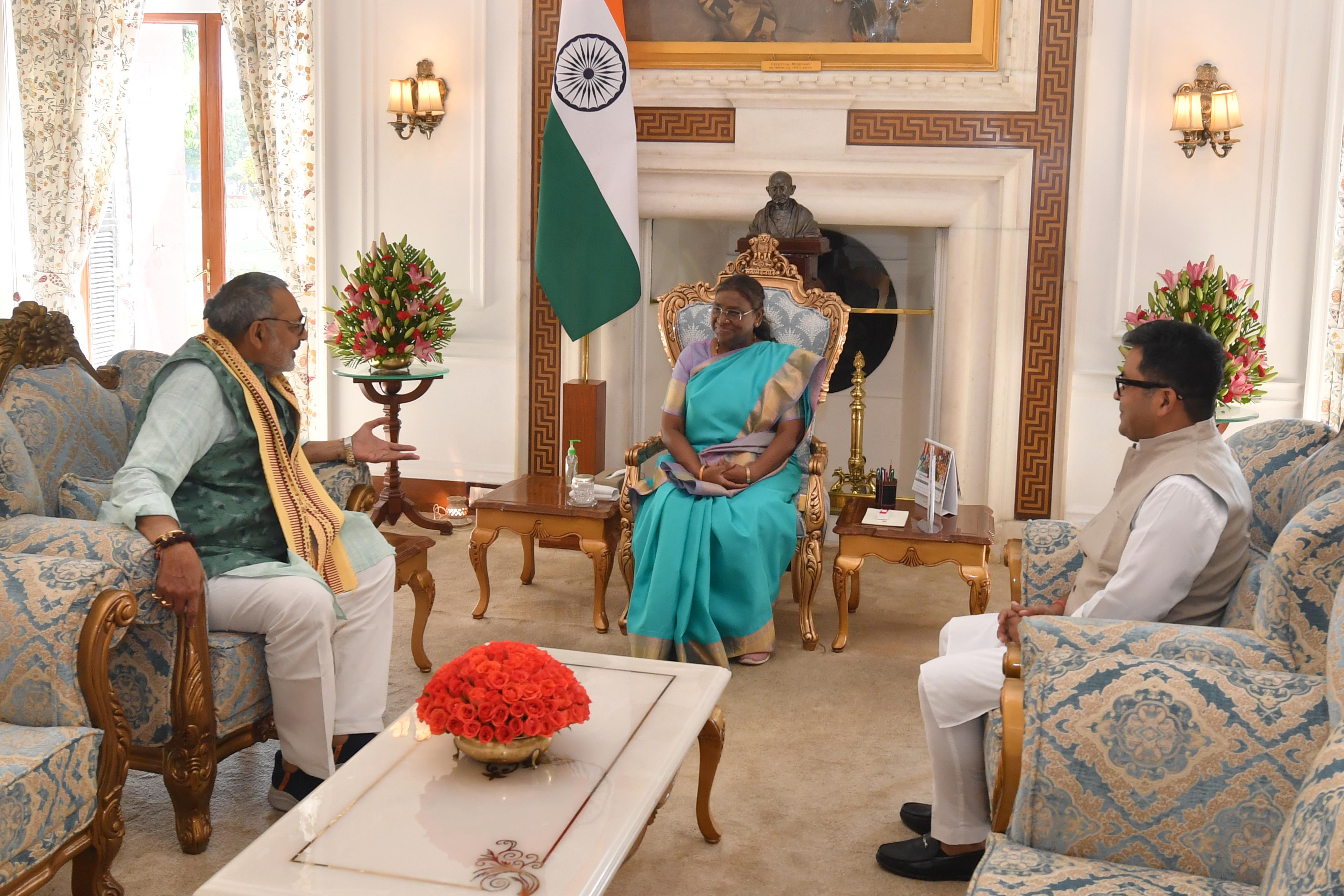 The Union Minister for Textiles, Shri Giriraj Singh along with Minister of State for Textiles, Shri Pabitra Margherita called on the President of India Smt. Droupadi Murmu at Rashtrapati Bhavan on June 20, 2024.