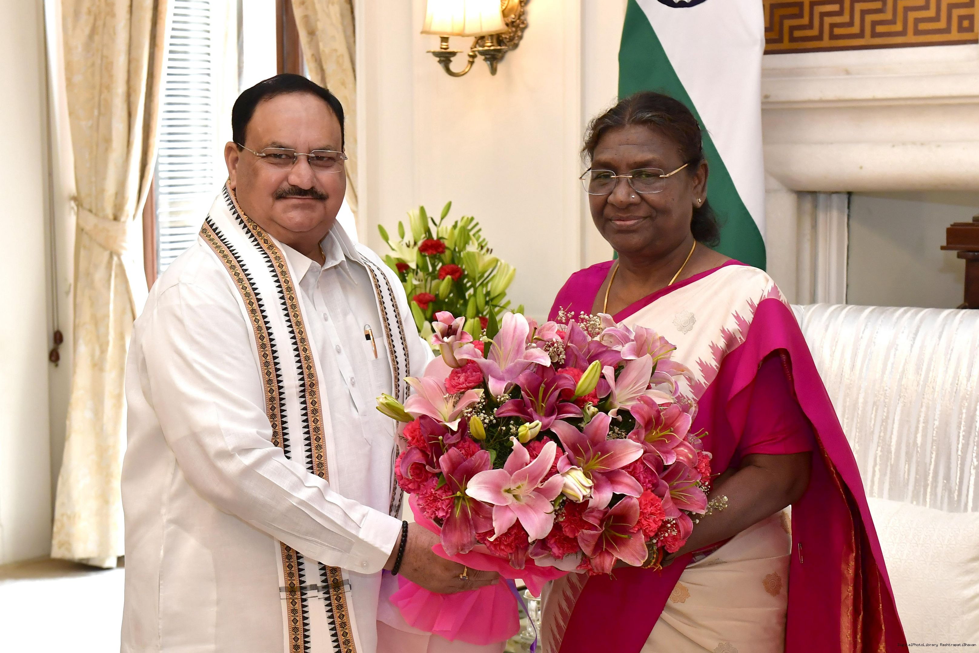 Shri J.P. Nadda, National President, BJP greeting the President of India, Smt. Droupadi Murmu on her birthday, at Rashtrapati Bhavan on June 20,2023