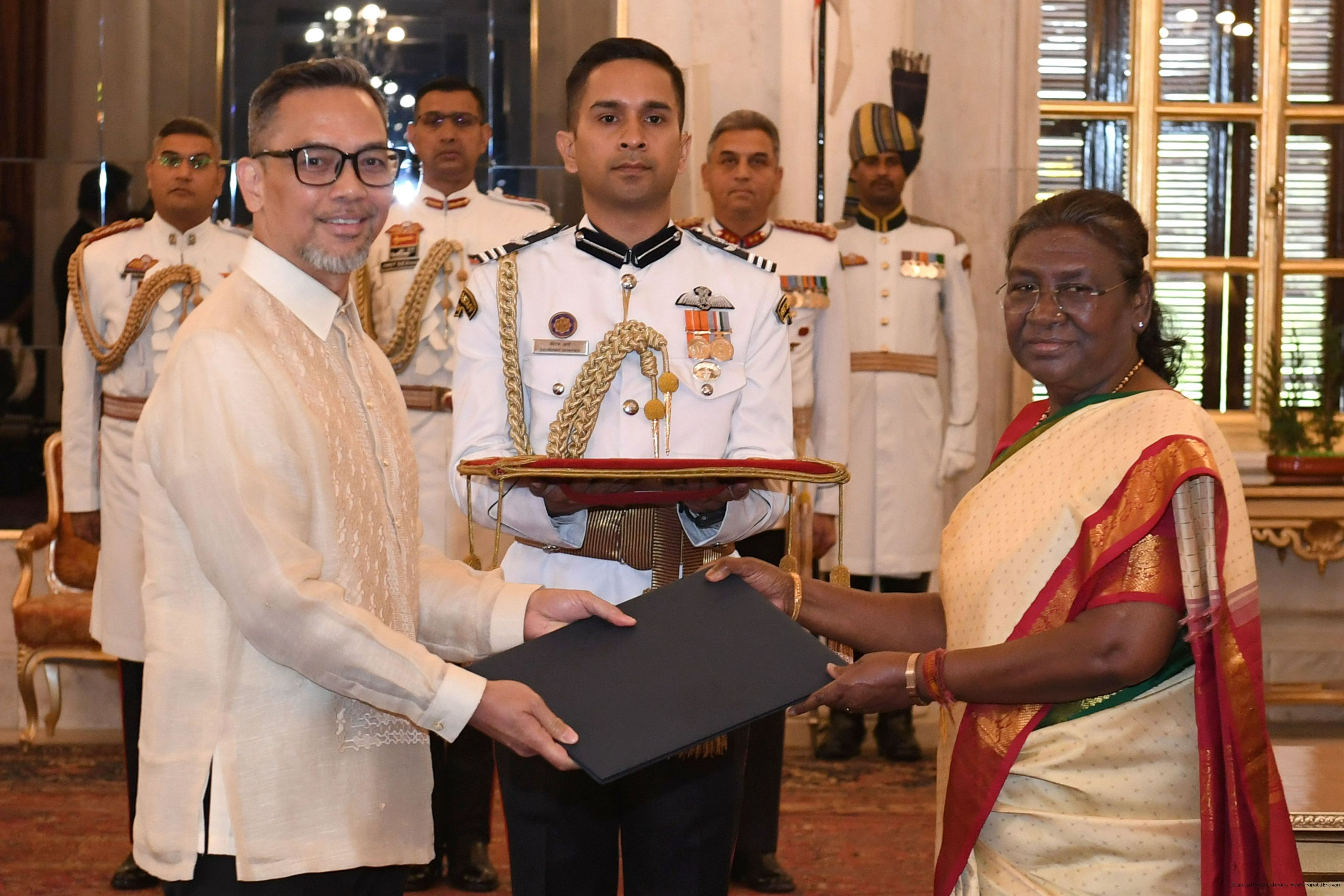 The Ambassador-Designate of the Republic of Philippines, H.E. Mr Josel Francisco Ignacio presenting his credentials to the President of India, Smt Droupadi Murmu at Rashtrapati Bhavan on March 27, 2024.