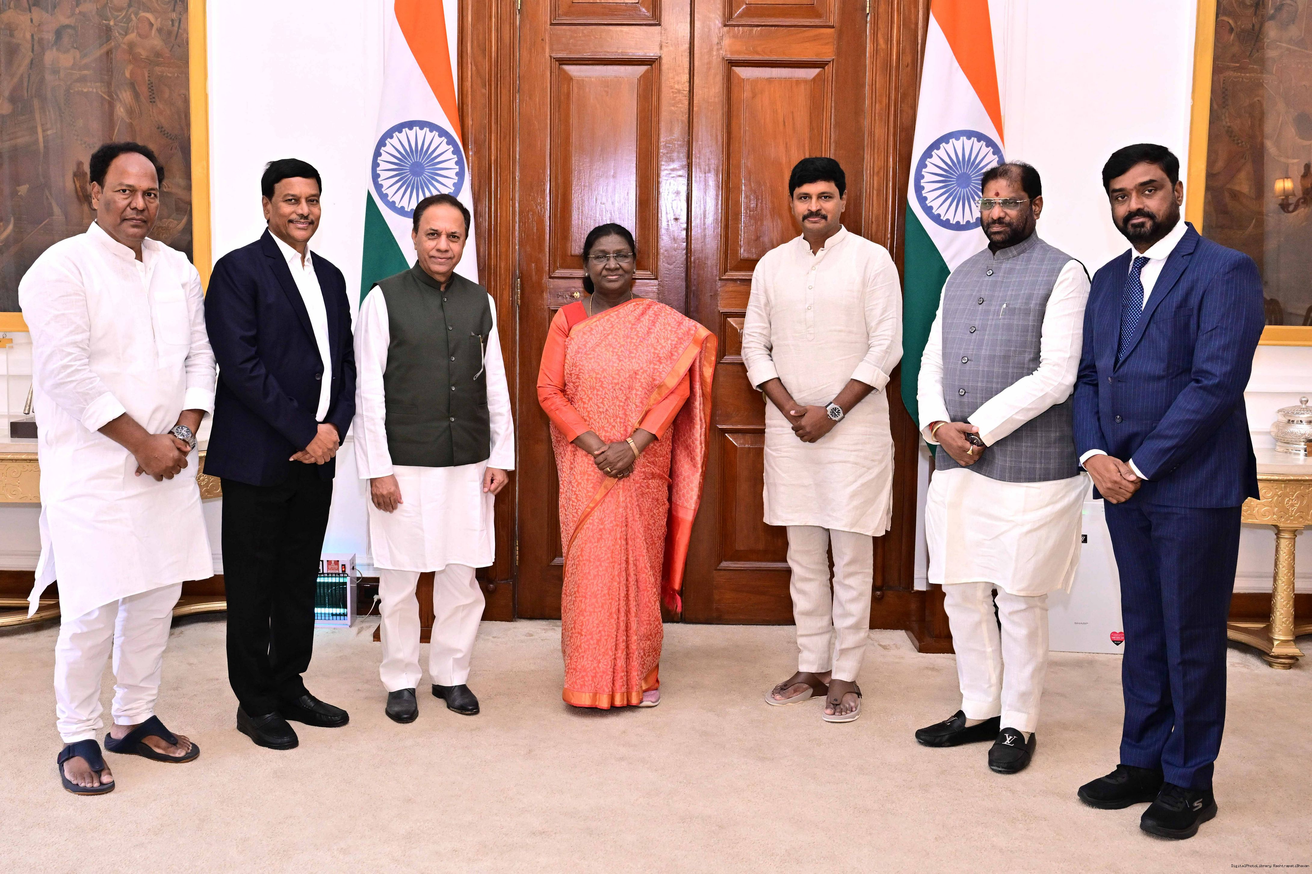 Shri K.R. Suresh Reddy, MP (RS) along with Shri Vaddiraju Ravichandra and others meeting with the President of India, Smt Droupadi Murmu at Rashtrapati Bhavan on April 9, 2026.