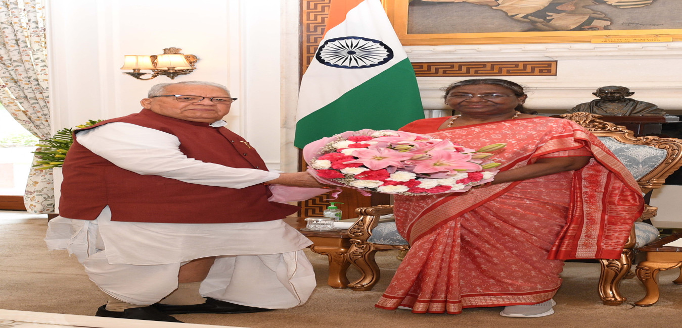 The Governor of Rajasthan, Shri Kalraj Mishra calling on the President of India, Smt. Droupadi Murmu, at Rashtrapati Bhavan on July 26, 2022.
