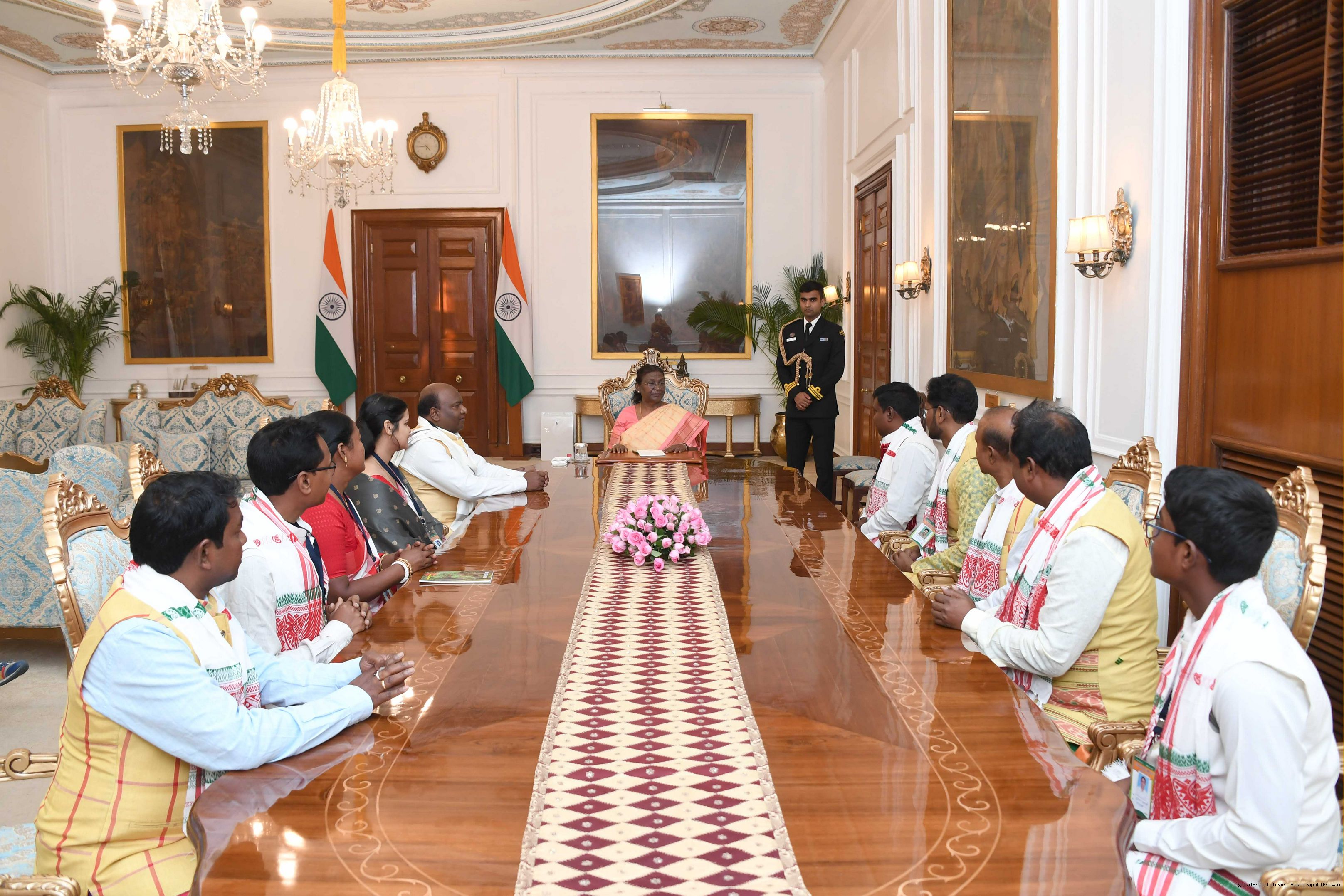 Shri Khetro Mohan Tudu, President, Dishom Jaher Garh Vikas Samiti (Nyas), Ranchi along with others meeting with the President of india smt. Droupadi Murmu at Rashtrapati Bhawan on December 08, 2023.