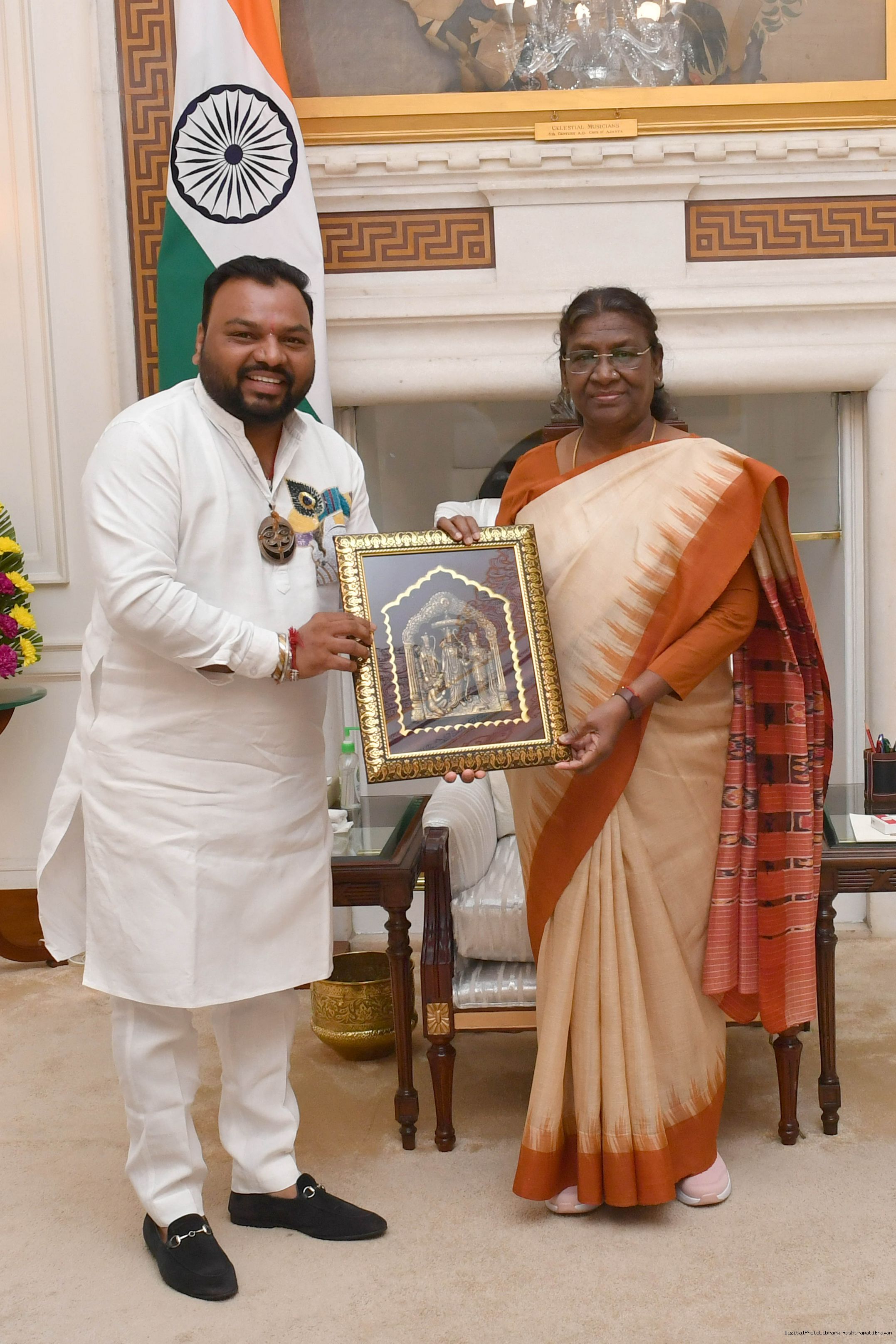 Shri Krishna Kanhiya Mittal along with Ms. Khushboo Yadav meeting with the President of India, Smt. Droupadi Murmu at Rashtrapati Bhavan on June 23, 2023.