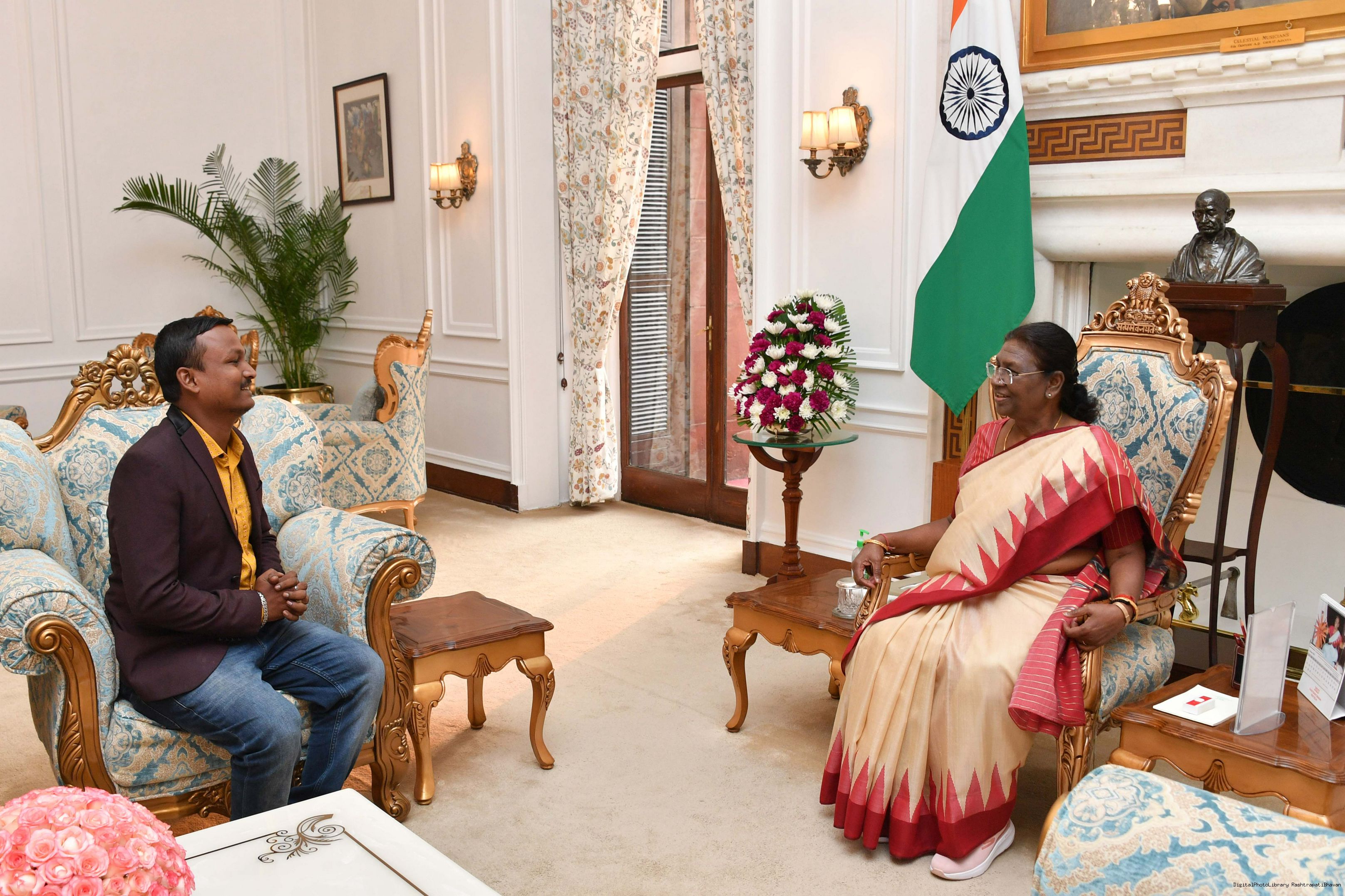 Shri Krushna Chandra Sahu from Chhotraypur, District Mayurbhanj meeting with the President of India Smt. Droupadi Murmu, at Rashtrapati Bhawan on October 30, 2023.