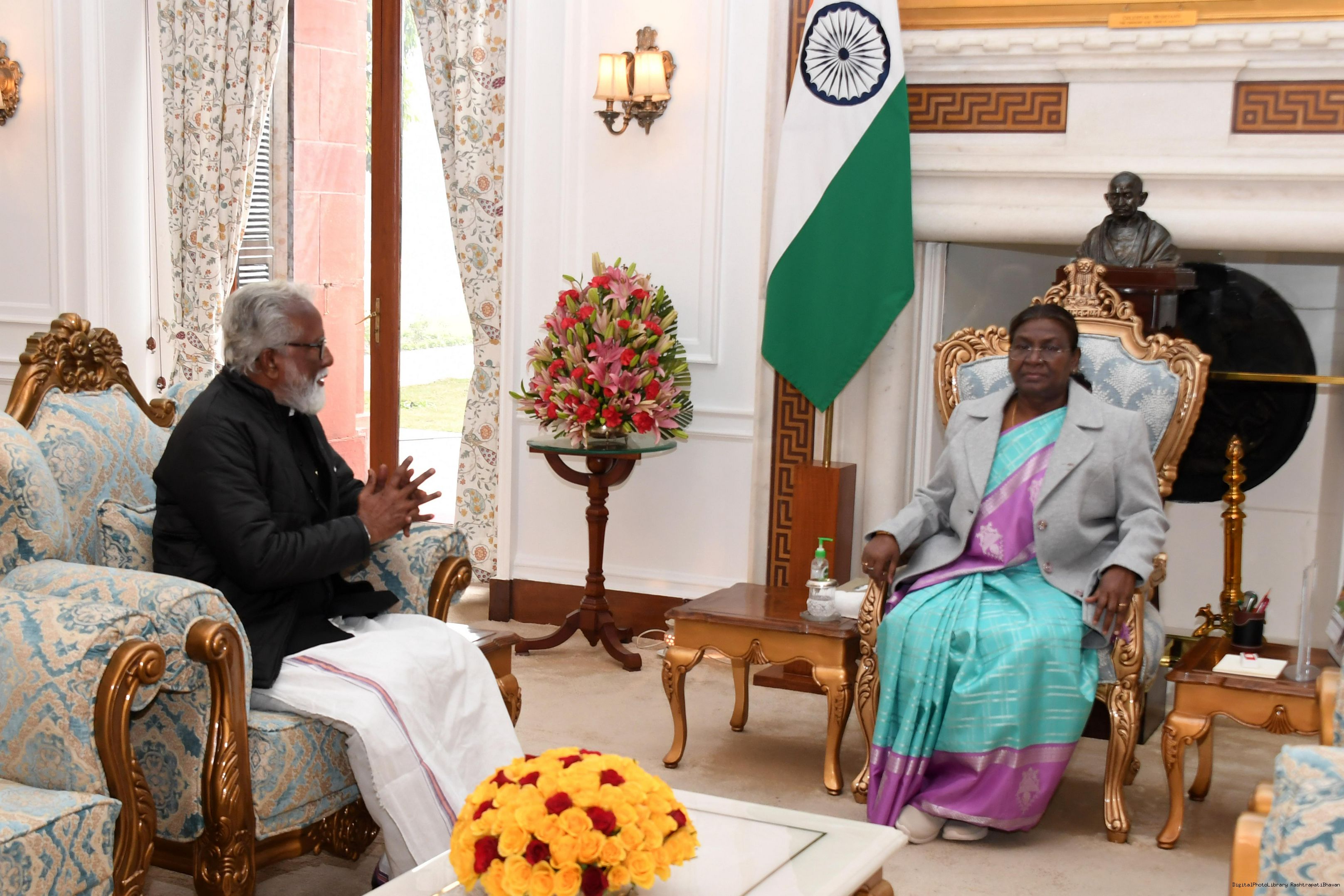 Shri Kummanam Rajasekharan, Former Governor of Mizoram and Chairman, Sugathakumari Navathi Celebrations Committee meeting with the President of India, Smt. Droupadi Murmu, at Rashtrapati Bhavan on Jan 24, 2024.