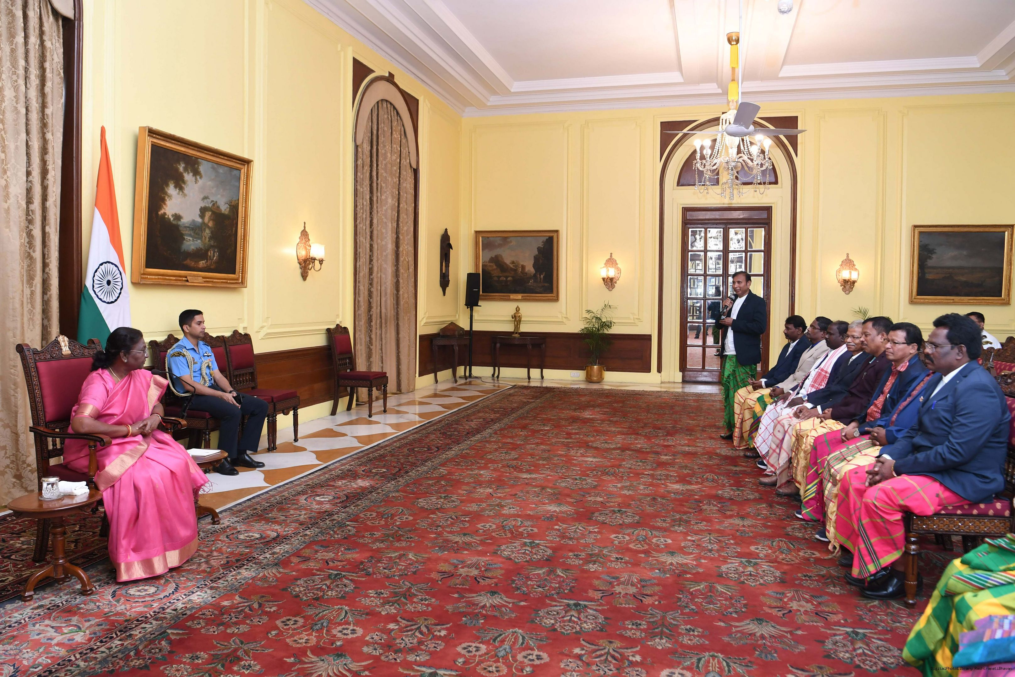 Shri Lambha Murmu, Secretary, Adibasi Socio-Educational Cultural Association (ASECA), Rourkela Branch Noha Tirla Gaonta, Rourkela along with 20 other members meeting with the President of India, Smt. Droupadi Murmu at Rashtrapati Bhavan on November 13, 2023.