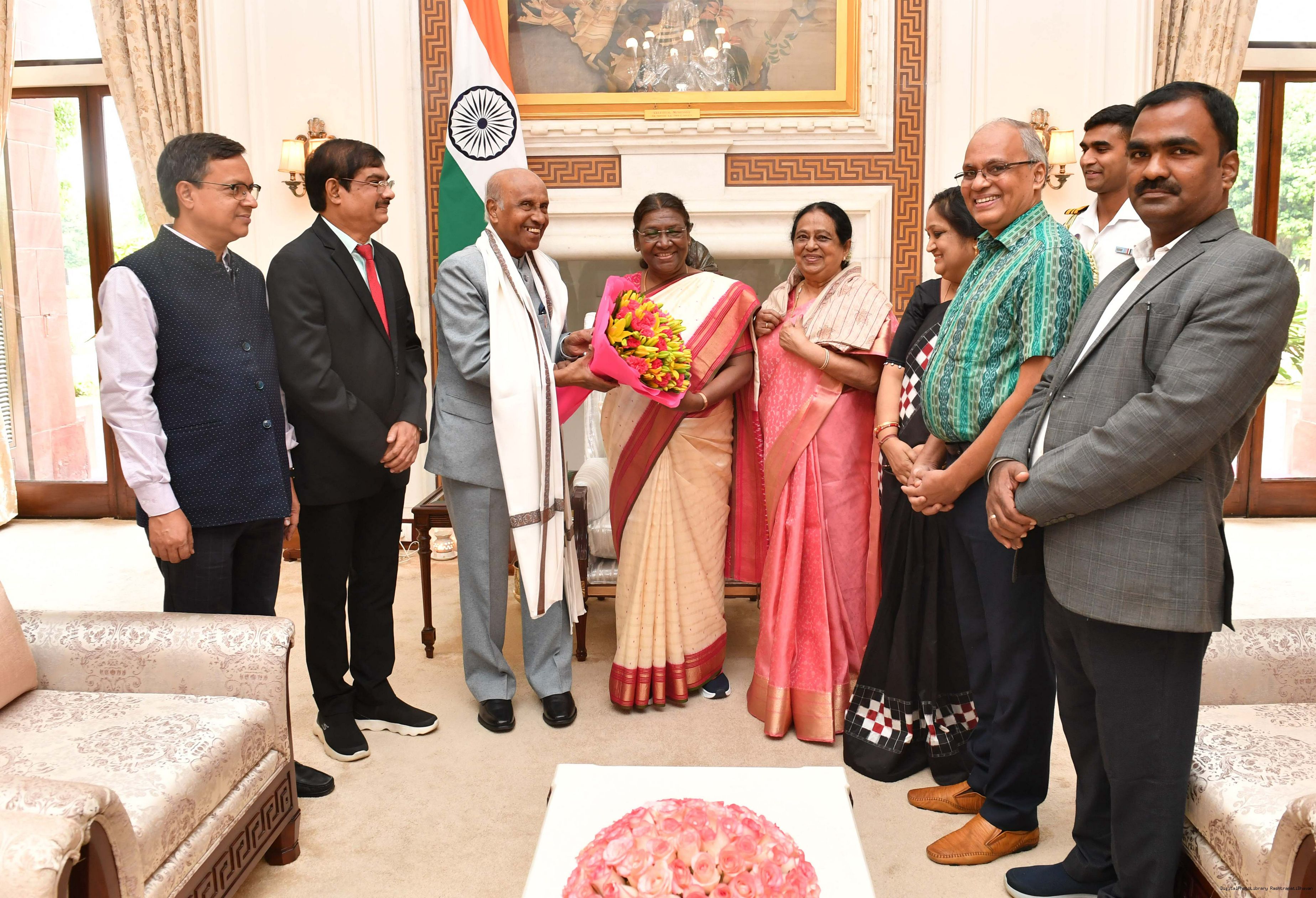 Shri M. M. Rajendran, Former Governor of Odisha along with others meeting with the President of India, Smt. Droupadi Murmu at Rashtrapati Bhavan on July 20, 2023.