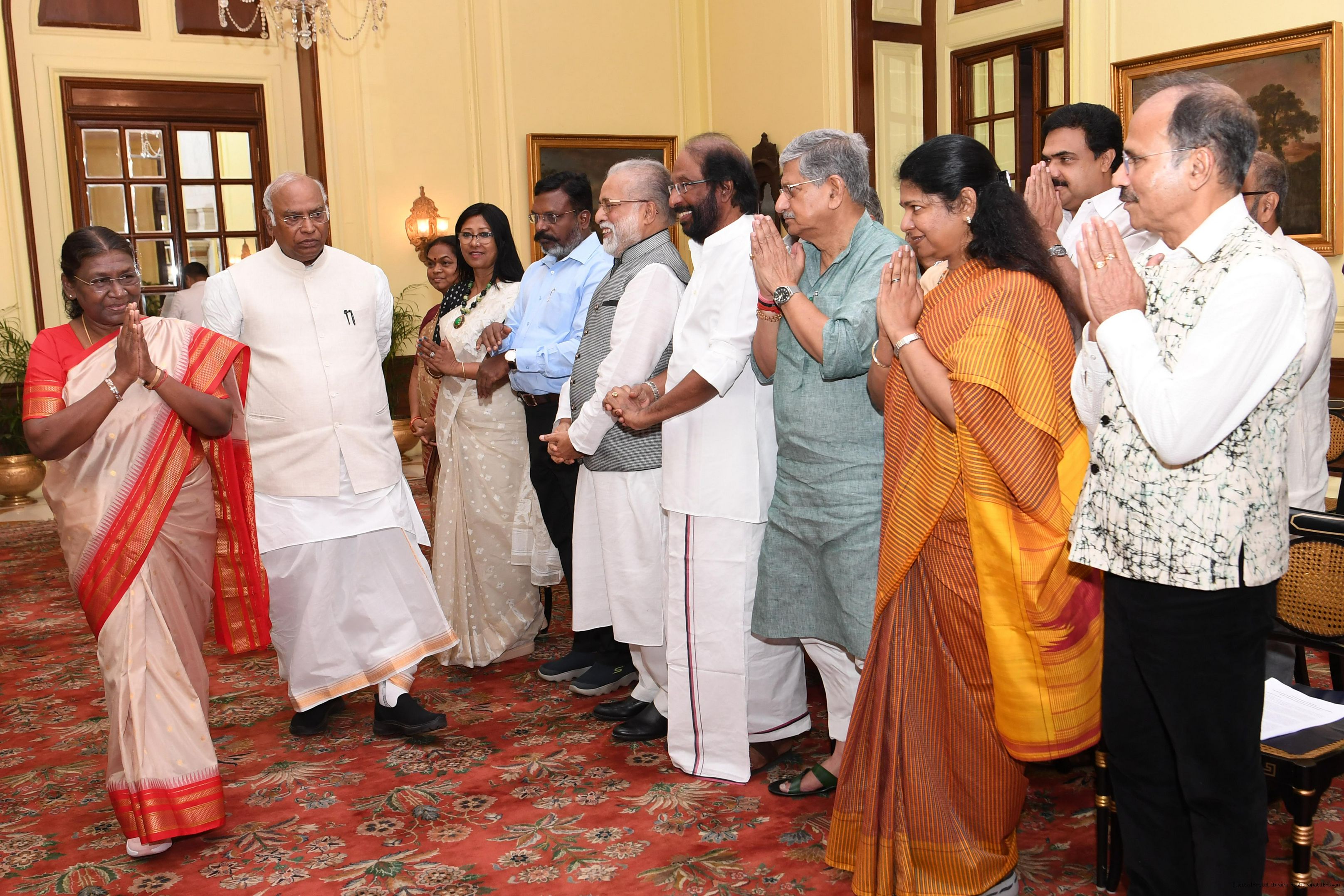 Shri Mallikarjun Kharge along with others Member of Parliament (Lok Sabha and Rajya Sabha) meeting with the President of India, Smt. Droupadi Murmu at Rashtrapati Bhavan on August 2, 2023.