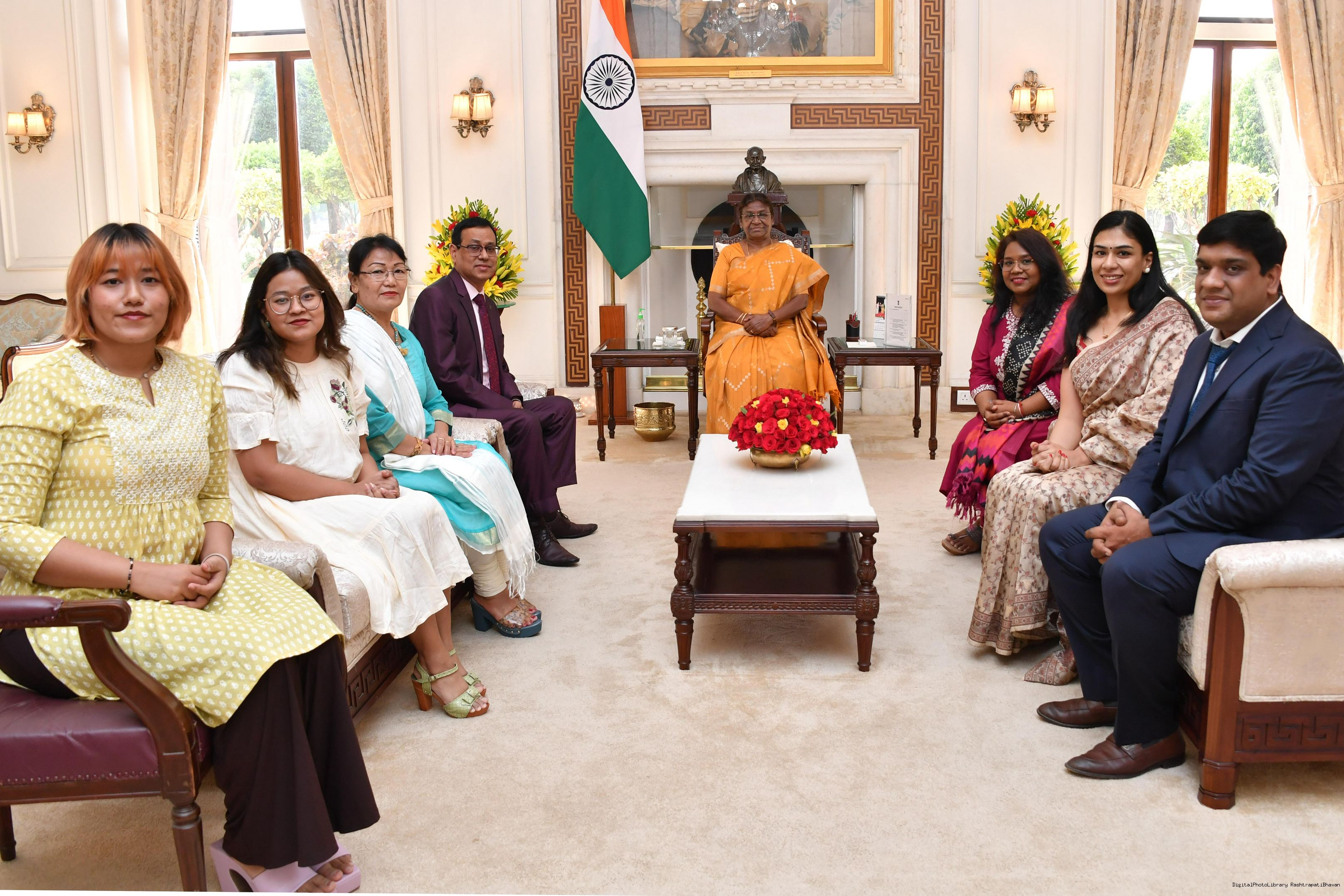 Shri Manish Kumar, General Manager, Human Resource Management, UCO Bank along with others meeting with the President of India Smt. Droupadi Murmu at Rashtrapati Bhavan on May 15, 2023.