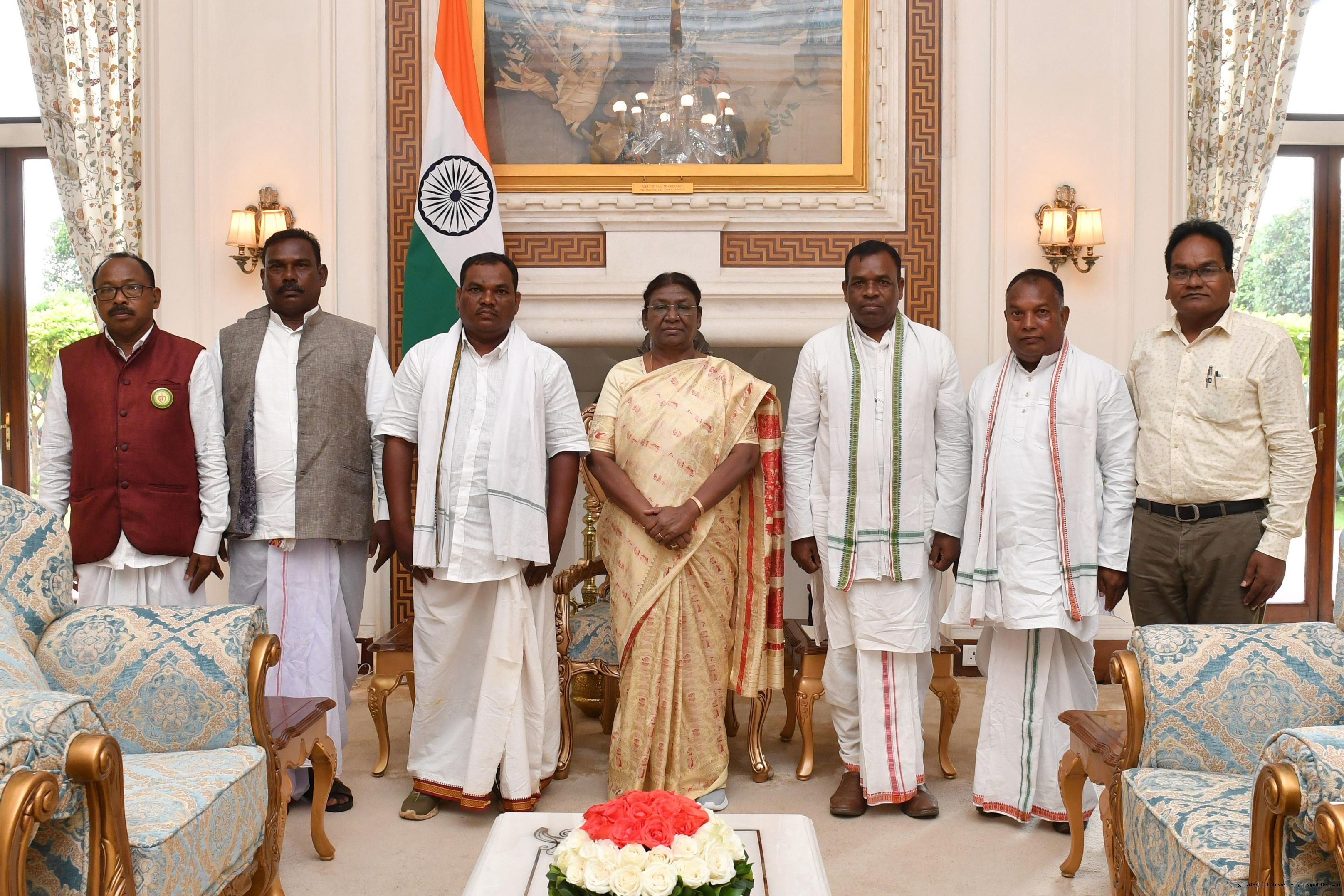 Shri Manoranjan Tiria along with others meeting with the President of India, Smt. Droupadi Murmu at Rashtrapati Bhavan on August 16, 2023.
