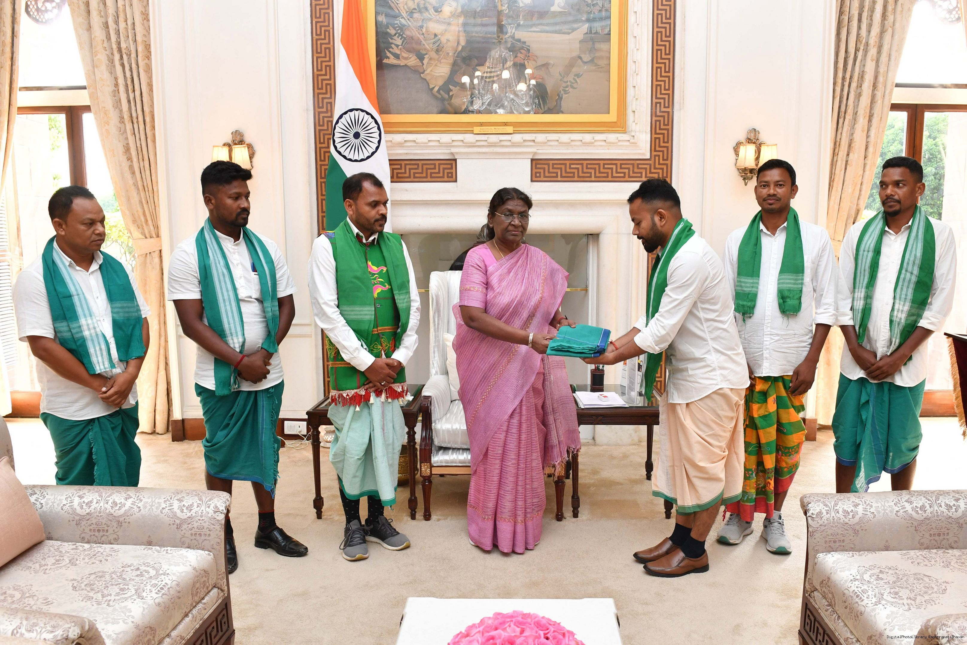 Shri Mintu Hemrom, President, All Santal Students' Union (ASSU), Kokrajhar, Assam along with others meeting with the President of India, Smt. Droupadi Murmu at Rashtrapati Bhavan on June 22, 2023.
