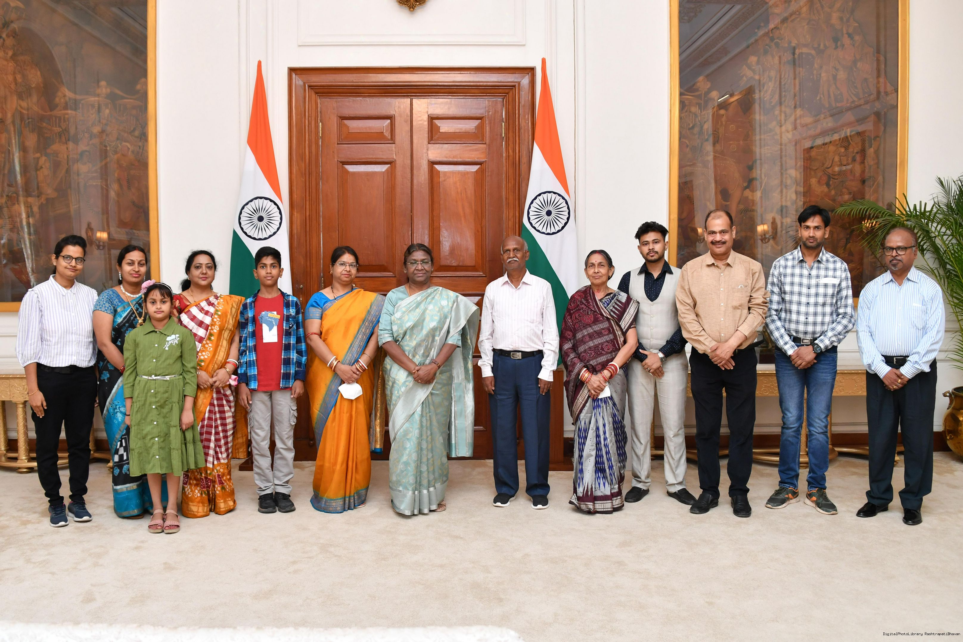 Shri Naba Kishore Pandaa along with others from Karanjia, Mayurbhanj, Odisha meeting with the President of India, Smt. Droupadi Murmu at Rashtrapati Bhavan on May 22, 2023