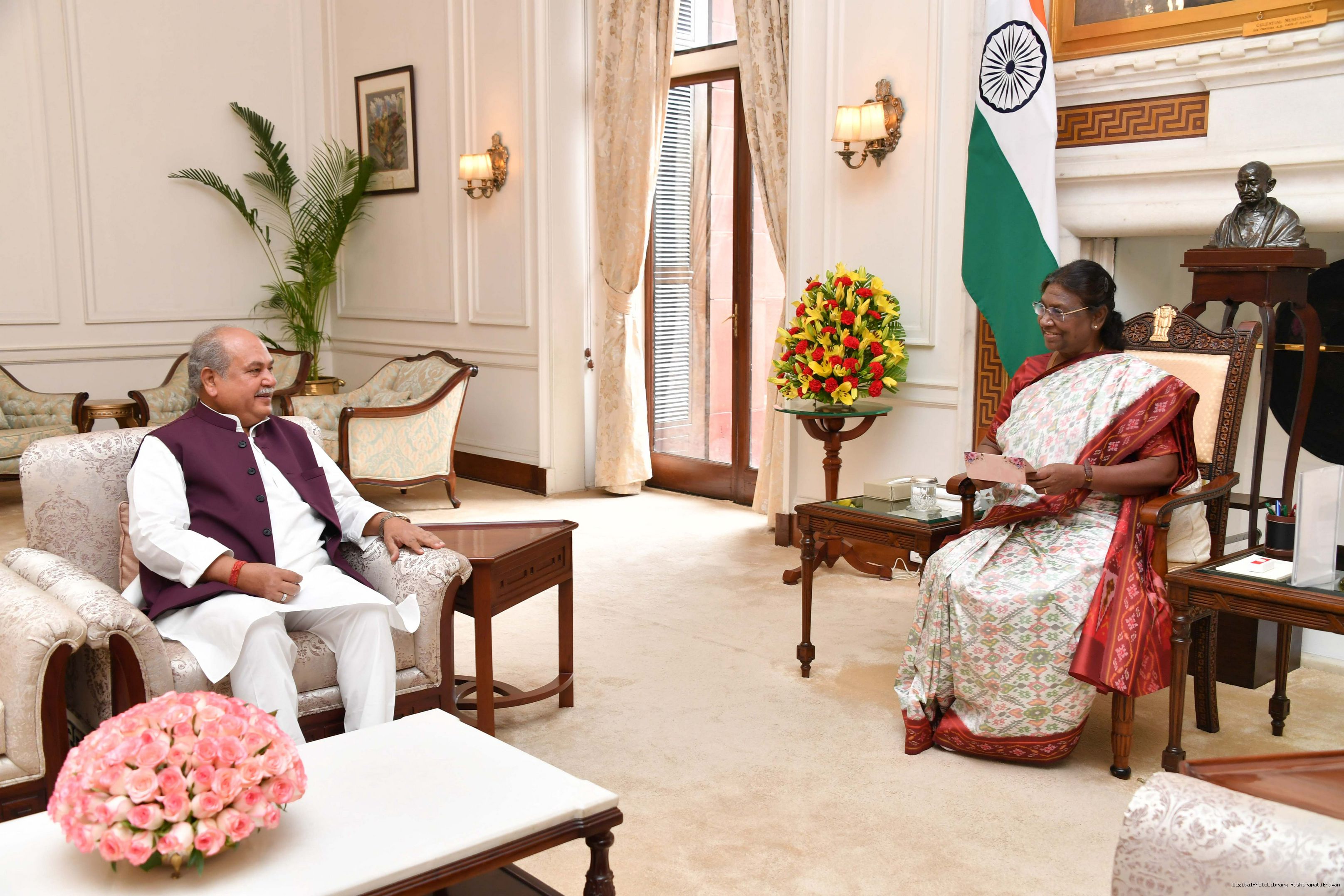 The Union Minister for Agriculture Farmers Welfare, Shri Narendra Singh Tomar called on President of India, Smt Droupadi Murmu at Rashtrapati Bhavan on June 01, 2023.