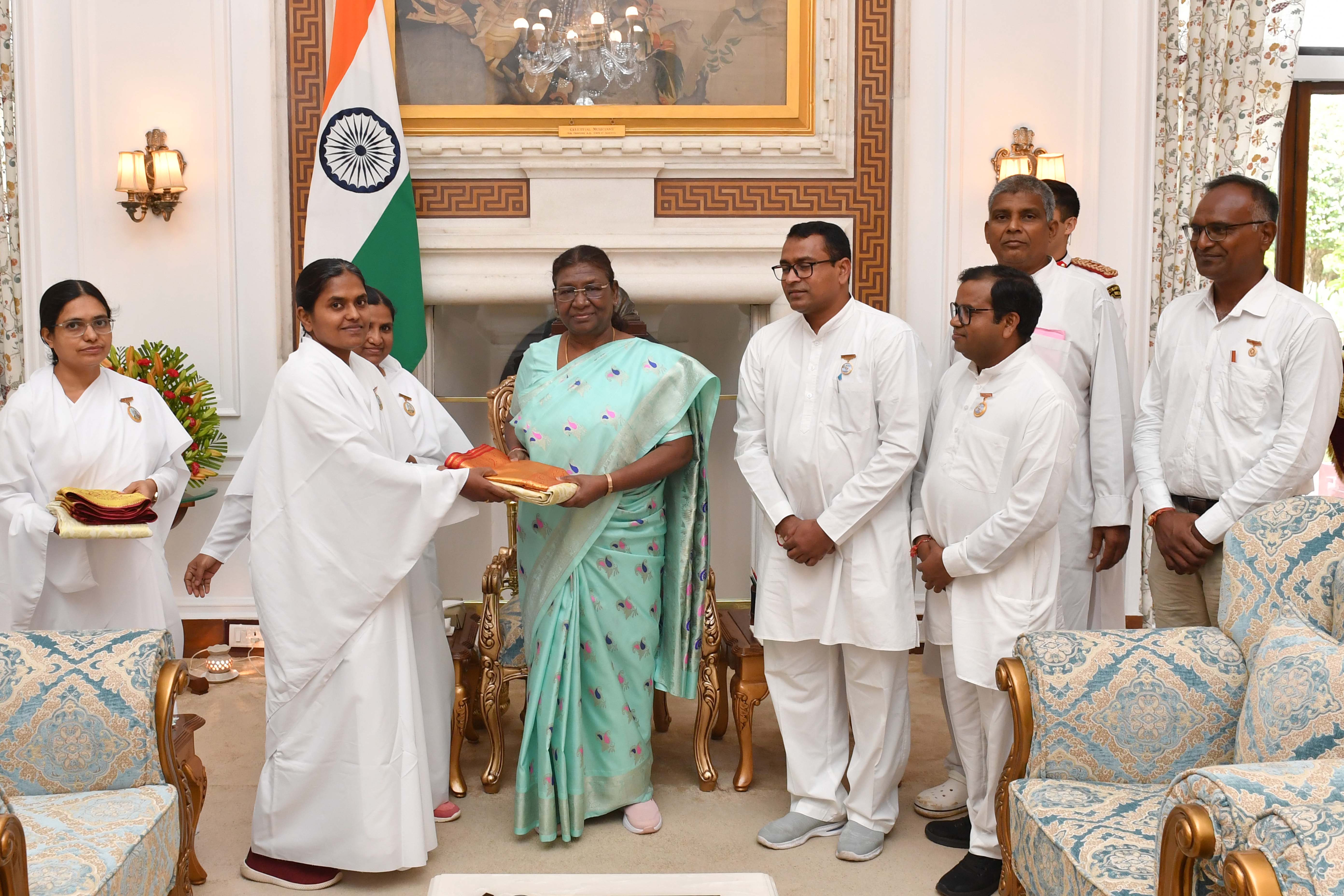 BK Neelima, Centre in Charge, Brahma Kumaris, Miyapur, Hyderabad along with others meeting with the President of India Smt Droupadi Murmu at Rashtrapati Bhavan on August 29, 2023.