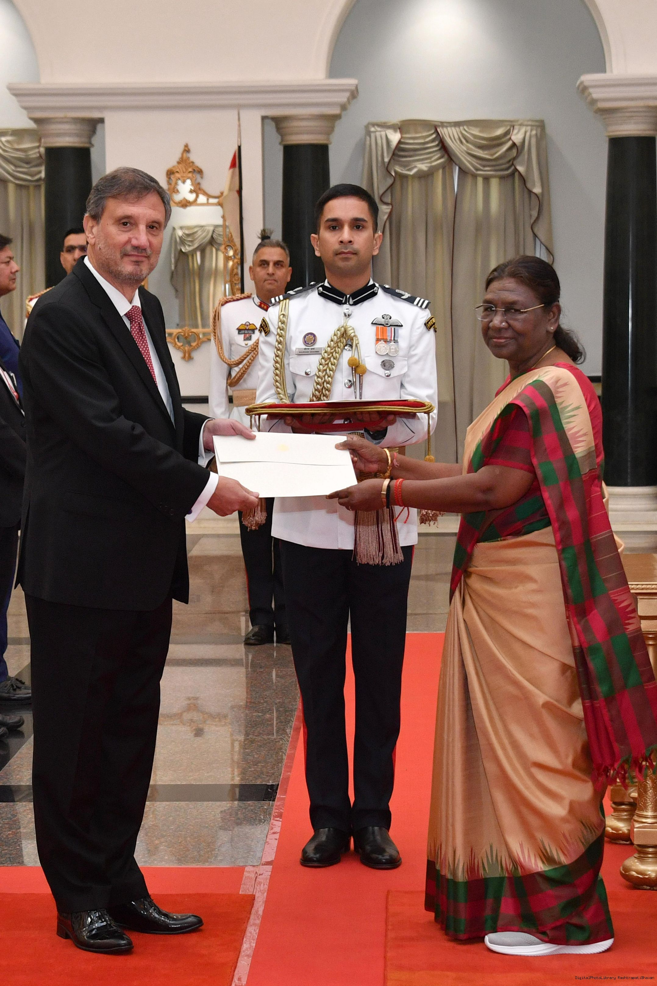 The Ambassador-Designate of the Republic of Bulgaria, H.E. Mr Nikolay Hristov Yankov presenting his credentials to the President of India, Smt Droupadi Murmu at Rashtrapati Bhavan on October 23, 2023.