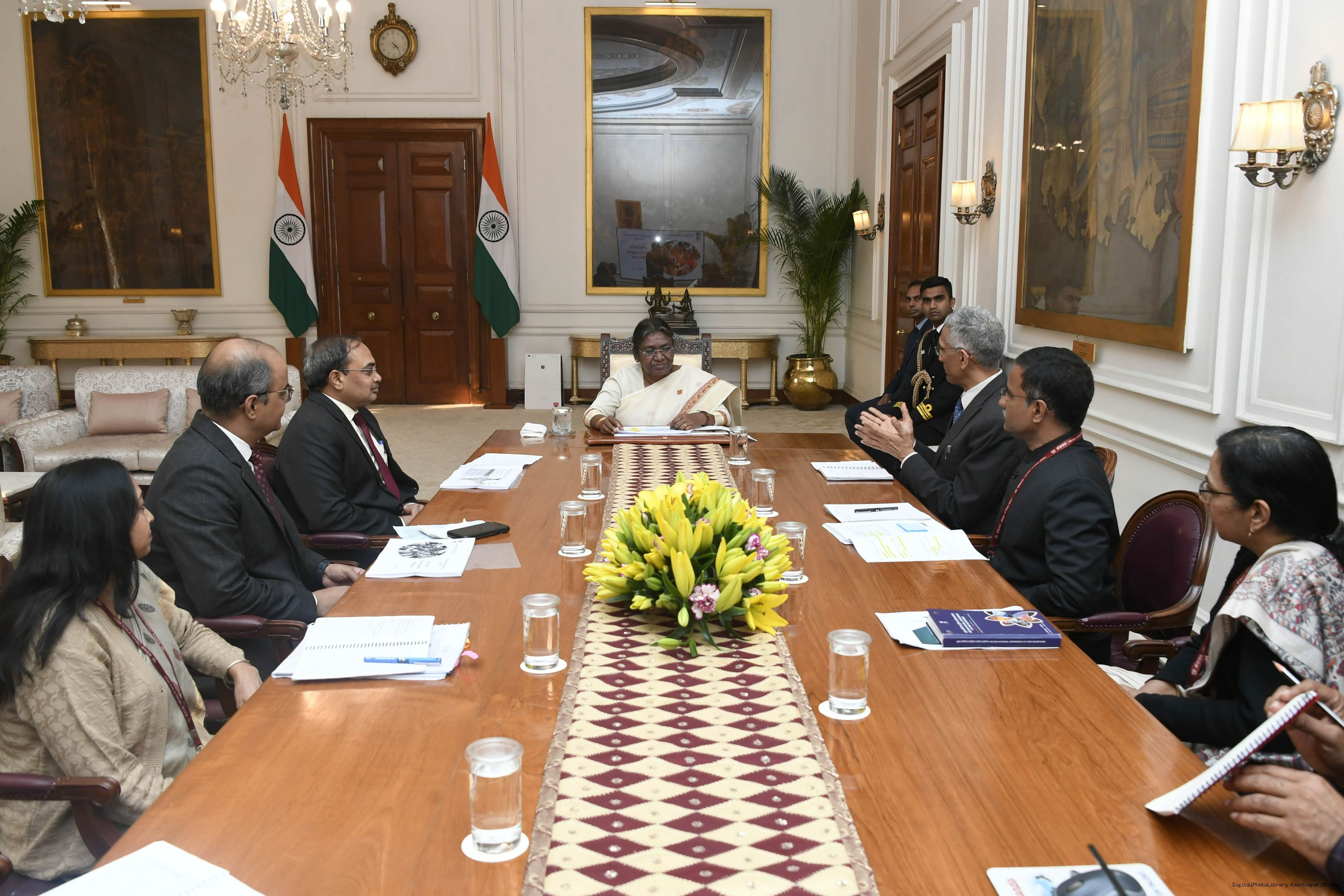 Shri Parameswaran Iyer, Chief Executive Officer along with other from NITI Aayog and Shri Anil Jha, Secretary with others from Ministry of Tribal Affairs meeting with the President of India Smt. Droupadi Murmu at Rashtrapati Bhavan on February 16, 2023.