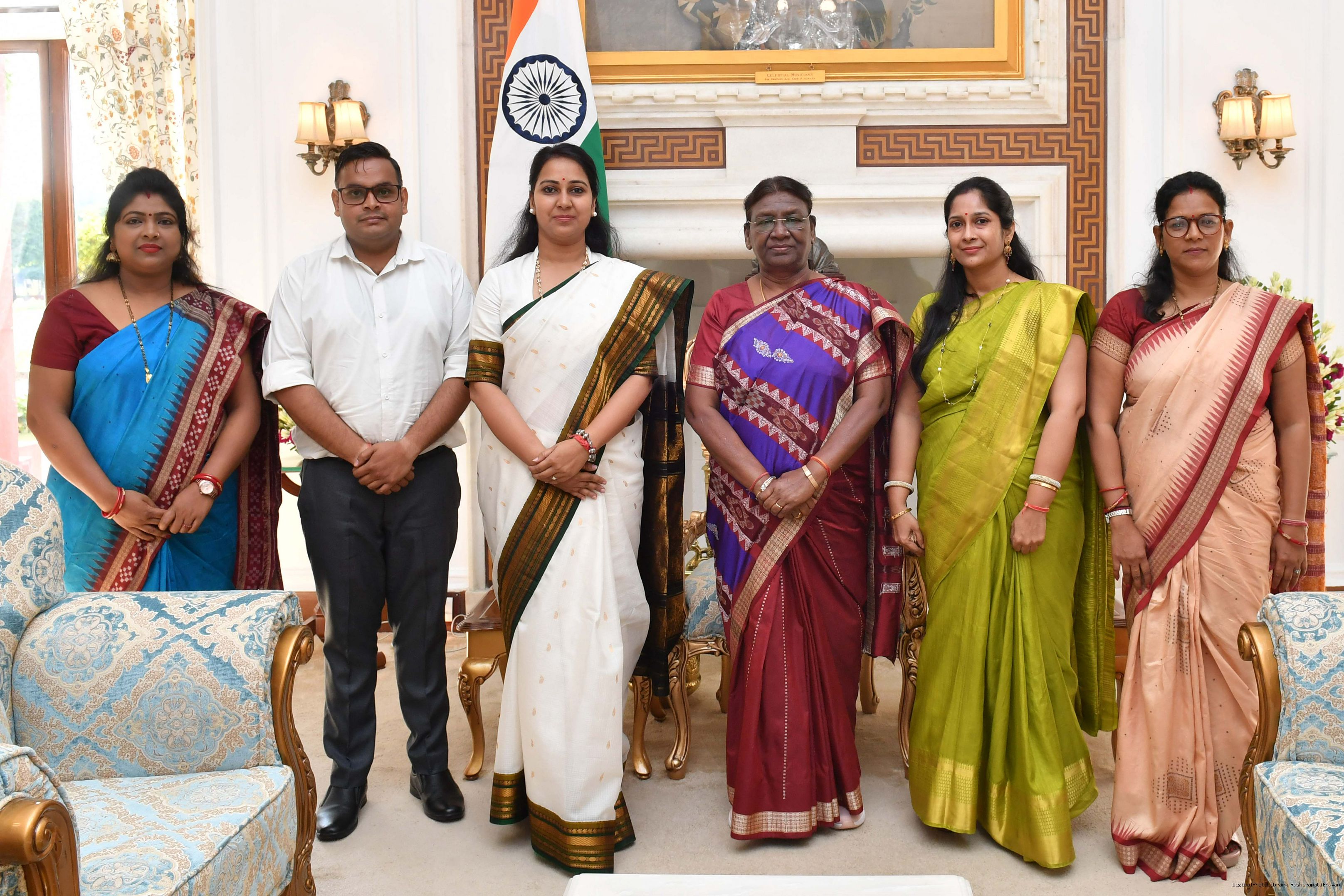 Shri Priyal Bhardwaj, General Secretary, BJP Morcha, Delhi along with others meeting with the President of India, Smt. Droupadi Murmu at Rashtrapati Bhavan on September 19, 2023.