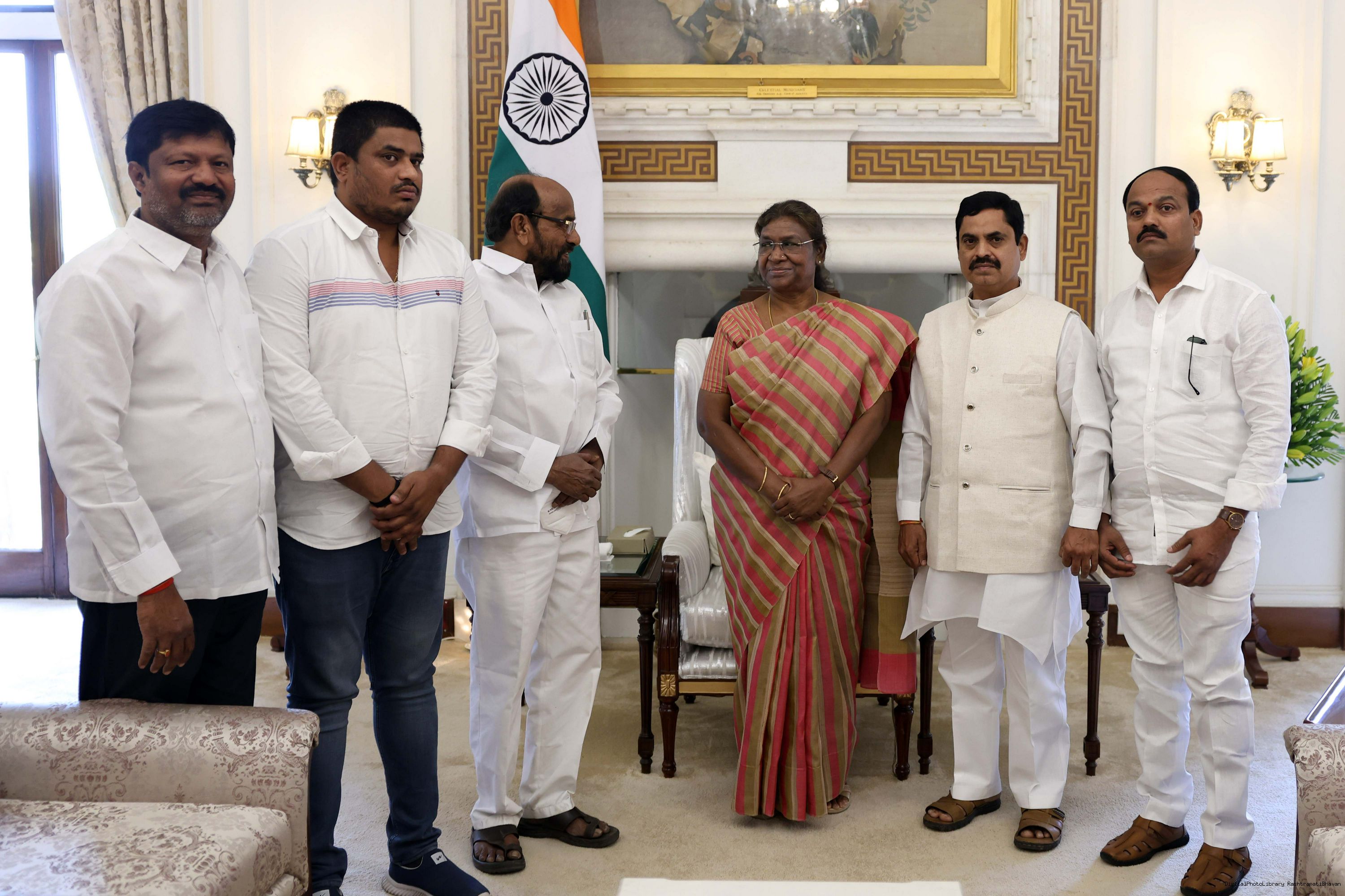 Shri R. Krishnaiah, MP (RS) from YSRCP, AP along with Shri Gujja Sri Krishna, Shri N. Bhupesh Sagar, Shri K. Ramu and Neelam Venkatesh, OBC leaders meeting with the President of India Smt. Droupadi Murmu at Rashtrapati Bhavan on April 11, 2023