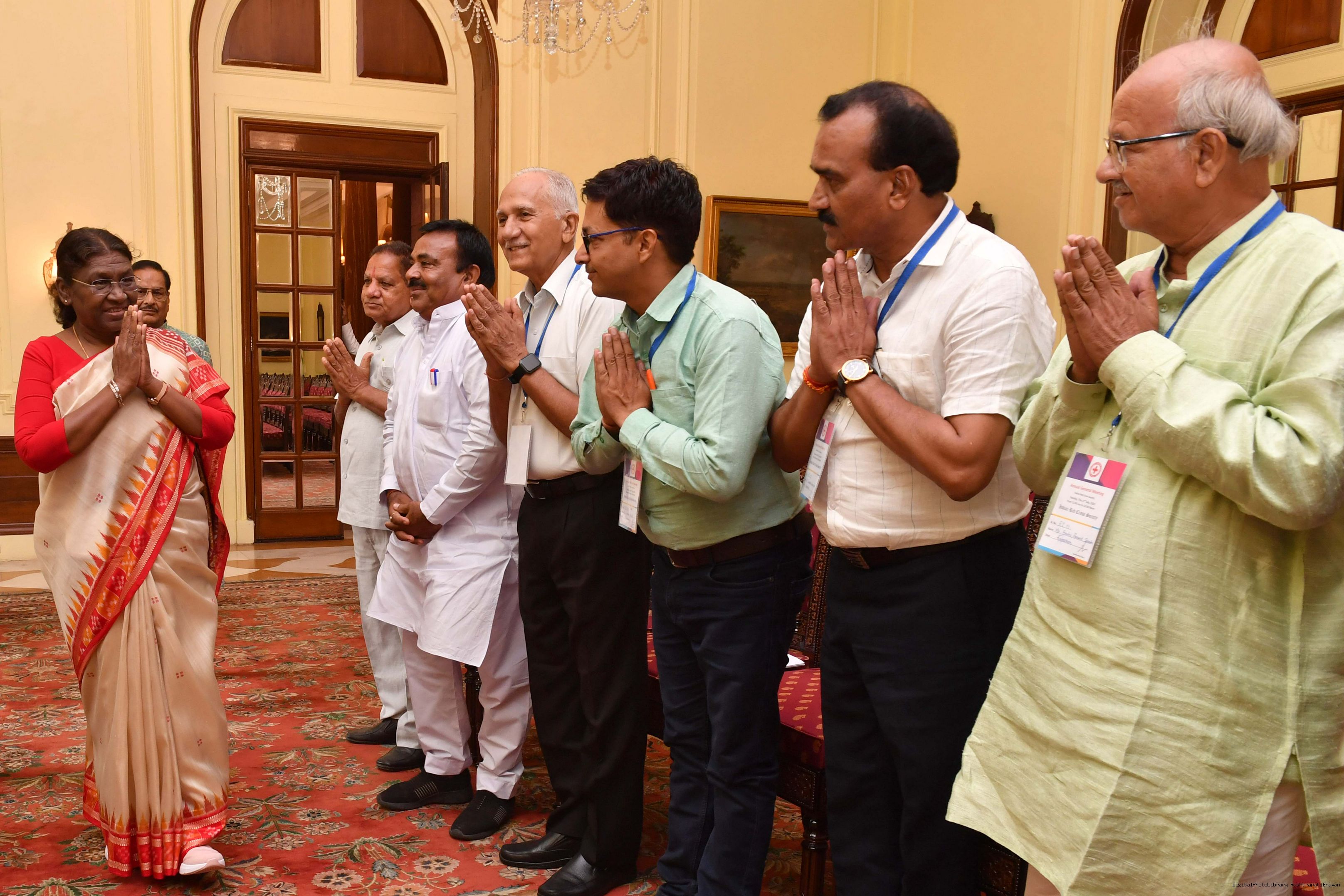 Shri Rajesh Krishna Birla, Chairman, Indian Red Cross Society, Rajasthan meeting with the President of India, Smt. Droupadi Murmu at Rashtrapati Bhavan on July 17, 2023.