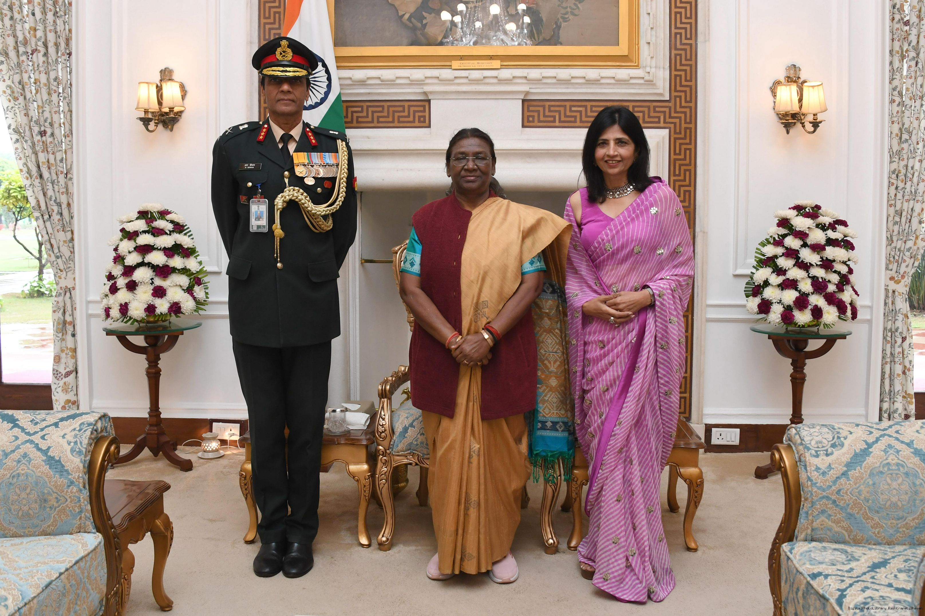 The Persident of india smt. Droupadi Murmu Lt Gen Rajinder Dewan, PVSM, AVSM, VSM, Quartermaster General along with his wife Smt. Isha Dewan Rashtrapati Bhawan on November 28, 2023